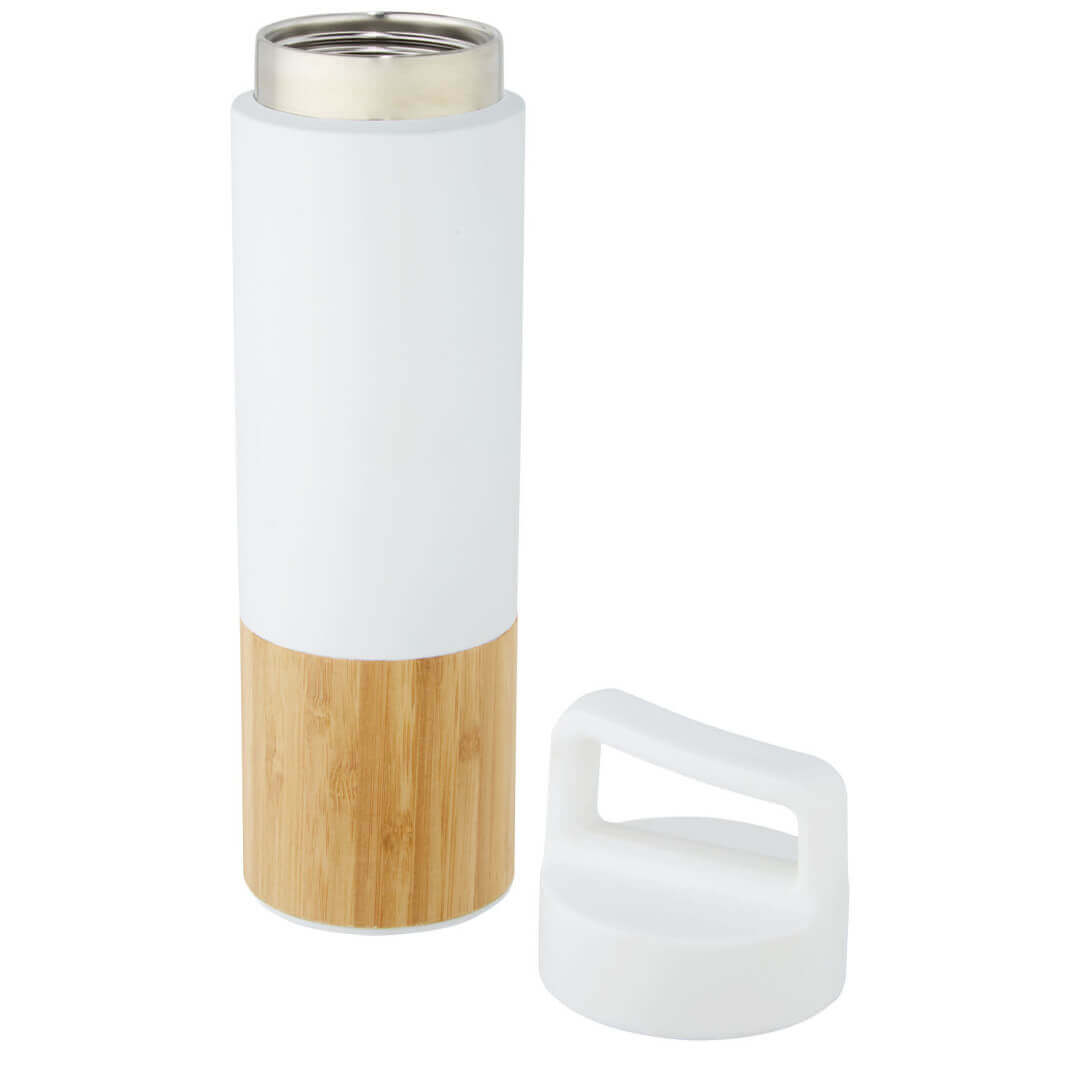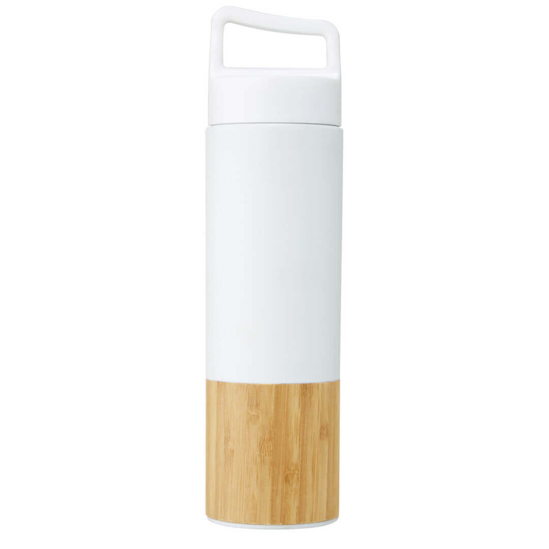Láhev z nerezové oceli 18/8 s měděnou vakuovou izolací, která udrží nápoje horké nebo studené po dobu několika hodin. Vyznačuje se trendy bambusovým detailem a díky víčku s uchem se snadno přenáší. Má široký otvor, který usnadňuje plnění a čištění. Testováno a schváleno podle německé legislativy pro bezpečnost potravin (LFGB), testováno na obsah ftalátů podle předpisů REACH. Objem 540 ml. Dodává se v dárkové krabičce z recyklované lepenky.