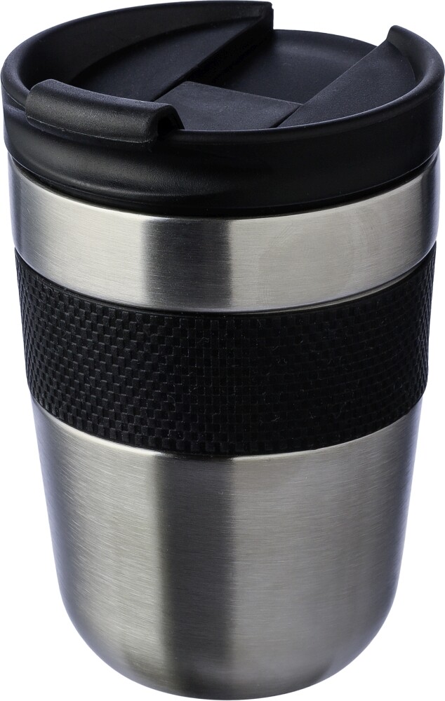 Dvoustěnný hrnek z nerezové oceli (300 ml) s víčkem z PP a silikonovým úchytem. Udrží obsah horký 4 hodiny a studený 6 hodin. Vnitřek je vyroben z nerezové oceli 304 a vnější strana z nerezové oceli 201. Jednotlivě baleno v hnědé kartonové krabici. Rozměry: 8,5 x 8,5 x 13 cm