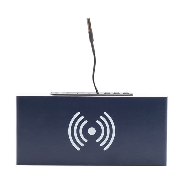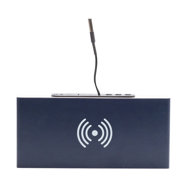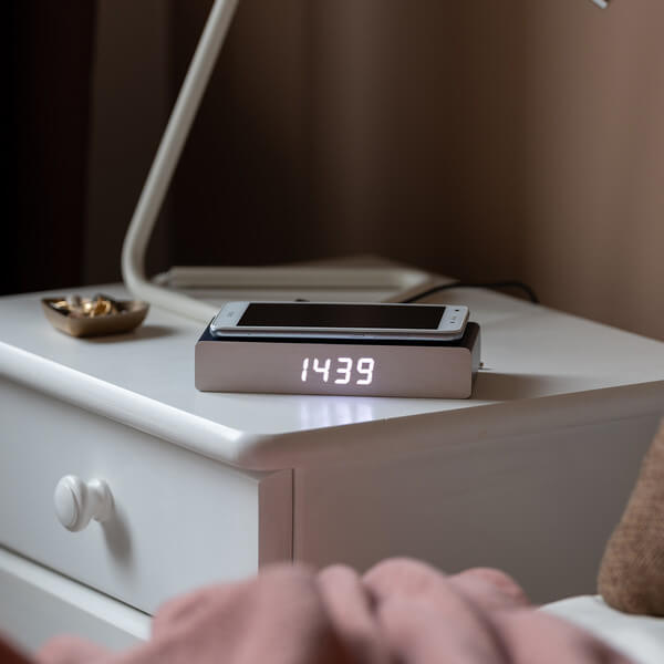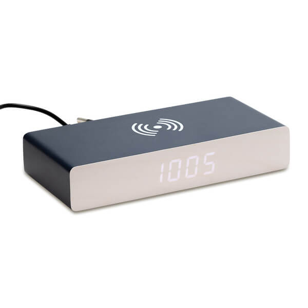 Hodiny s bezdrátovou stolní nabíječkou v jednom. Napájeno kabelem USB a 2 bateriemi LR1130. Funkce: alternativní zobrazení času, data a teploty, možnosti nastavení úrovně jasu displeje, 3 alarmy. Při nastavení do úsporného režimu se hodiny přepnou do režimu spánku a displej je neaktivní. Pro probuzení displeje stačí zatleskat rukama nebo se dotknout hodin. Kabel a baterie součástí setu. Nabíječka je vhodná pro telefony s funkcí bezdrátového nabíjení. Výkon: 5 W.