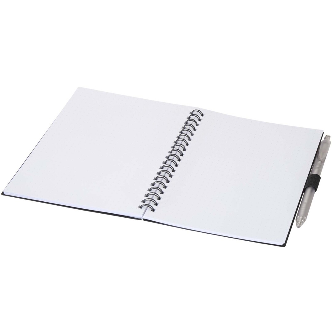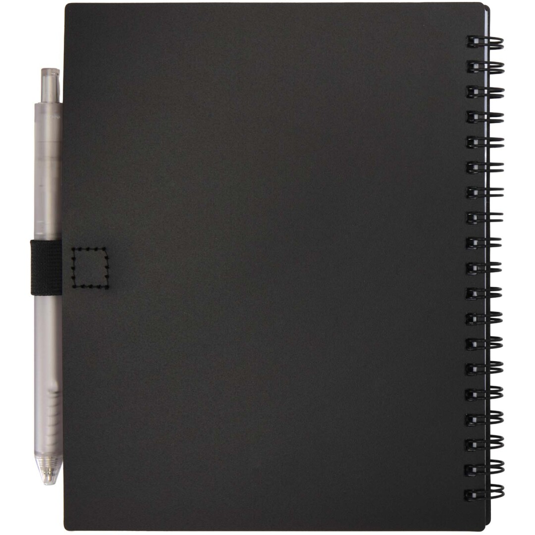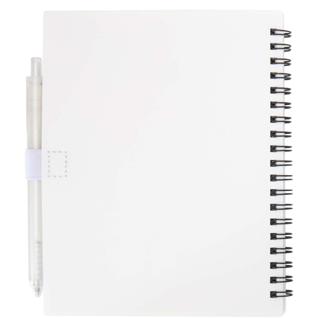Poznámkový blok Niove s měkkou vazbou je vyroben z recyklovaného plastu a má 70 tečkovaných listů papíru o gramáži 70 g/m². Zápisník má zaoblené rohy a poutko na pero. Velikost zápisníku: 140 × 178 mm. Kuličkové pero je rovněž vyrobeno z recyklovaného plastu. Barva inkoustu: Modrá. Délka psaní: 1000 metrů. Rozměr hrotu: 1,0 mm. Recycled PP Plastic.