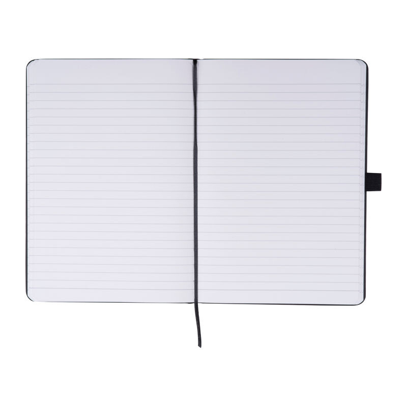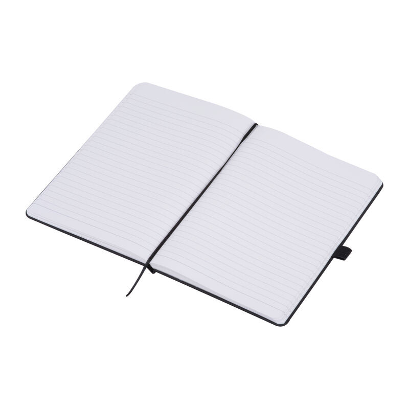 A5 Notebook s PU obálkou, kartou, zavíracímu proužku, smyčce pero a 120 propojených stran kamenného papíru. Tento speciální papír se skládá z uhličitanu vápenatého a je odolný vůči oleji a vodě, antistatický, obtížně nafouktelný, bez granulární struktury a především odolný vůči trhání.