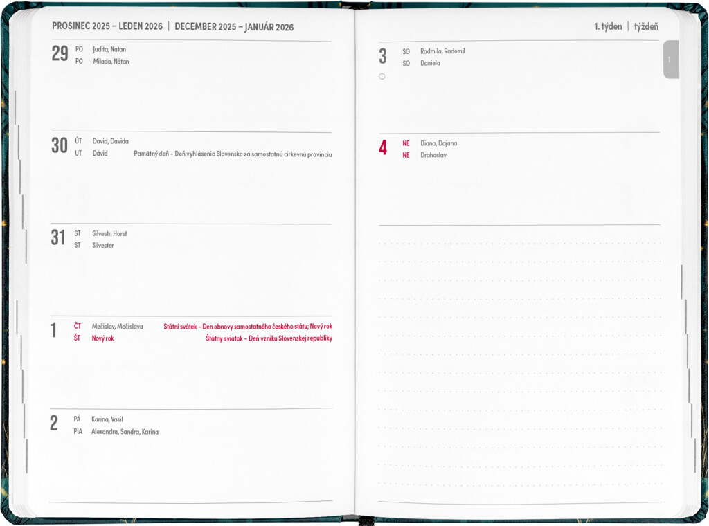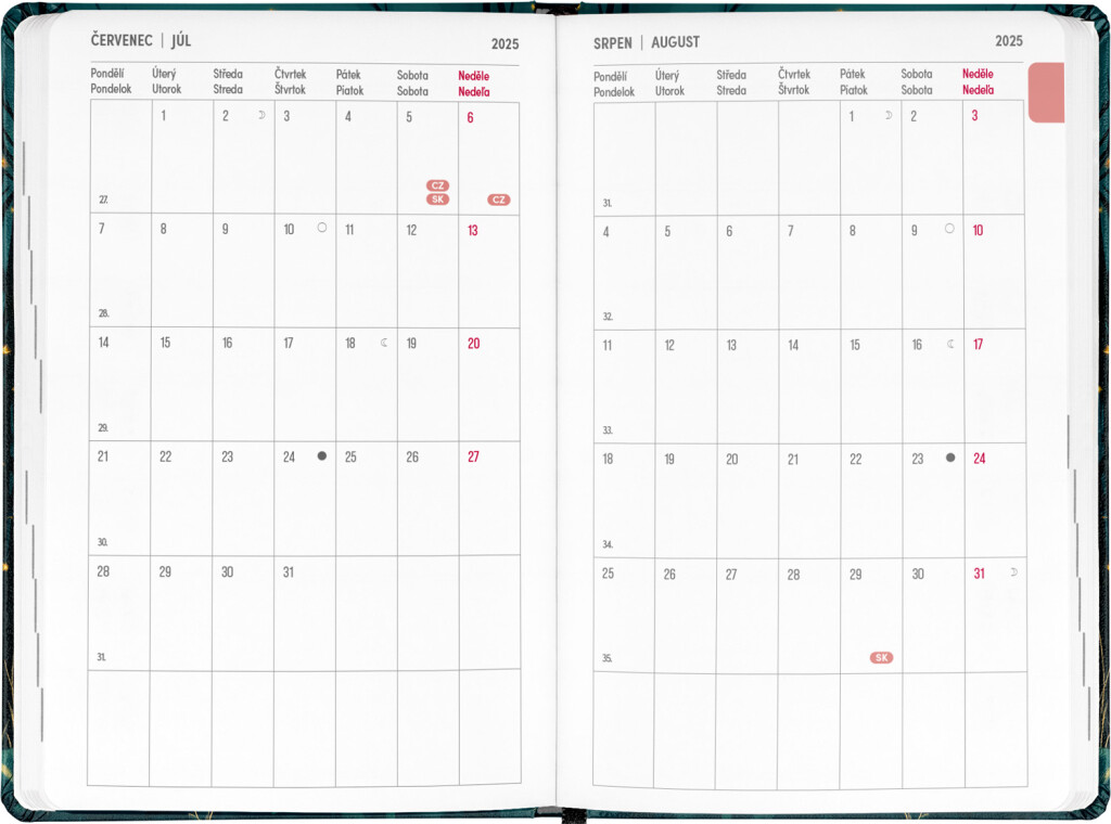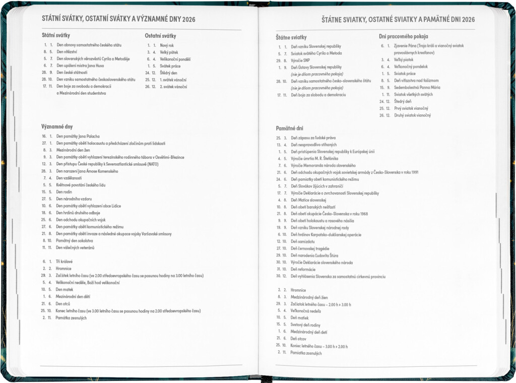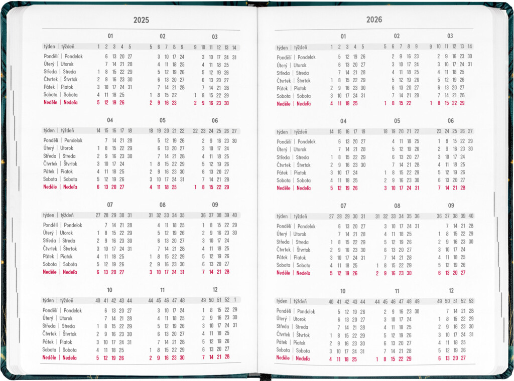Osmnáctiměsíční diář obsahuje přehled na roky 2025 a 2026, seznam českých a slovenských jmen, česko-slovenský týdenní kalendář se jmény a svátky a prostor pro poznámky. Kalendář začíná v červenci 2025 a končí v prosinci 2026.