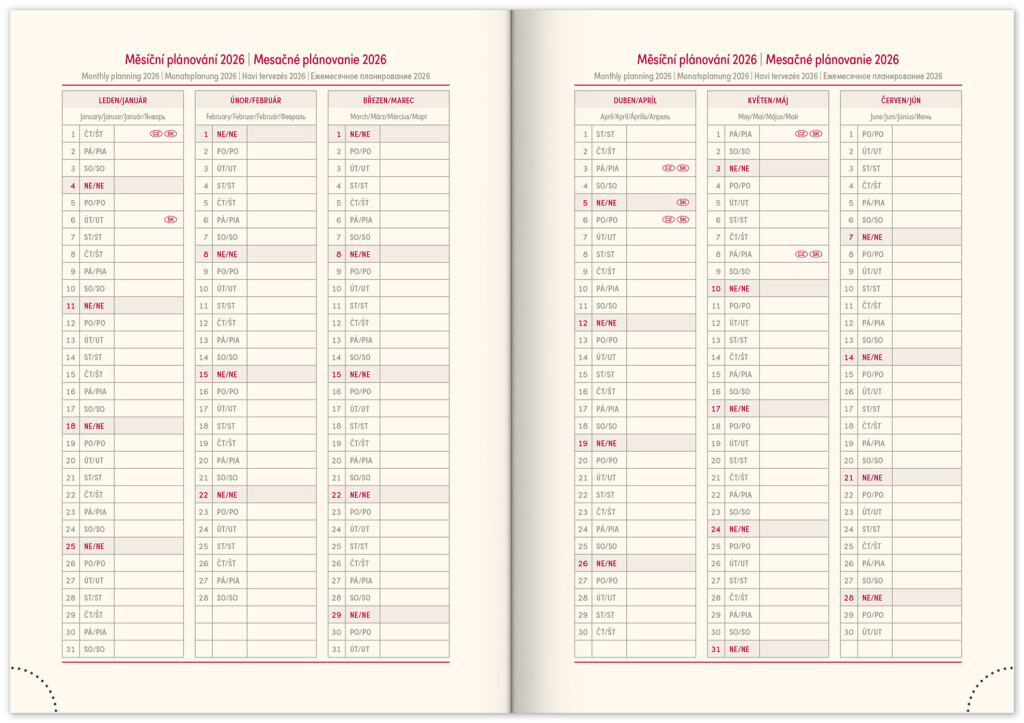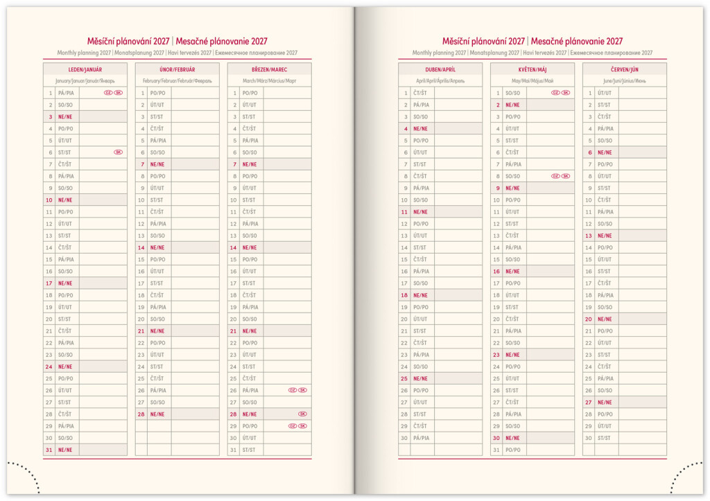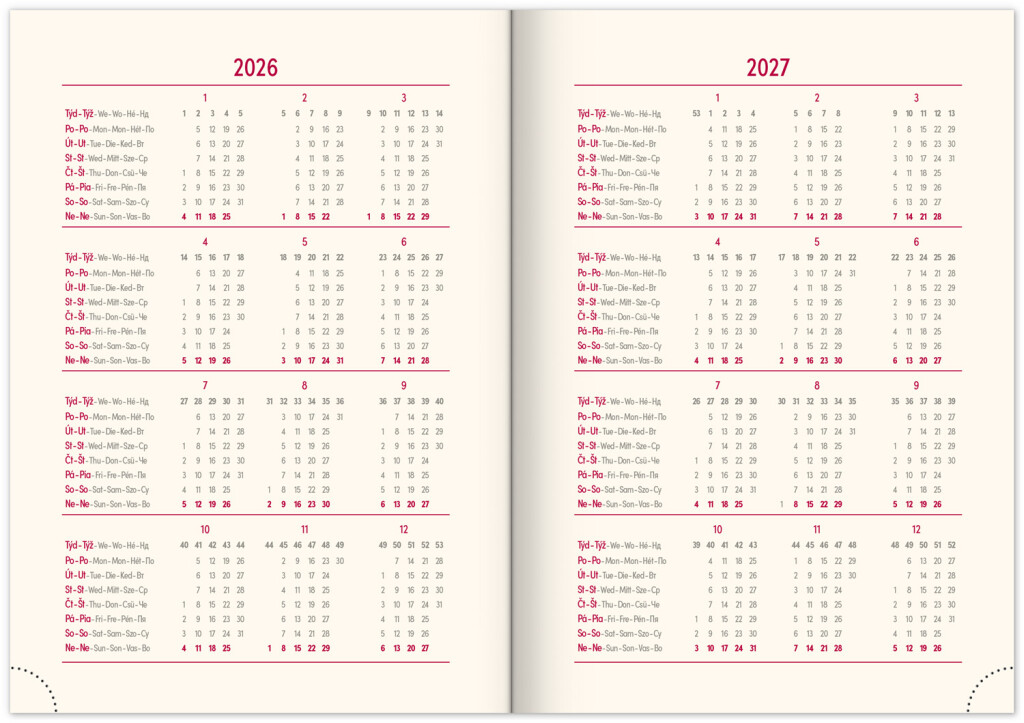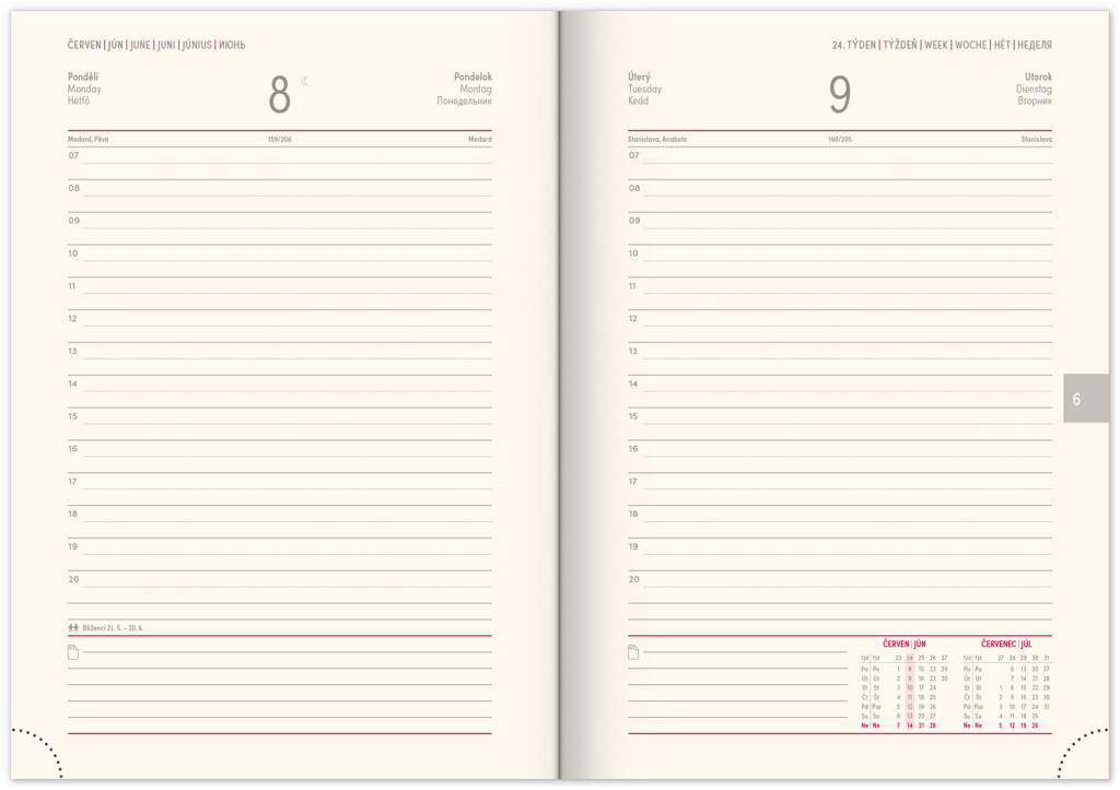 Nová řada diářů v moderním designu s pevnou gumičkou a poutkem na pero. Denní rozvržení s česko-slovenským kalendáriem a doplňkovými anglickými, německými, maďarskými a ruskými diáři.