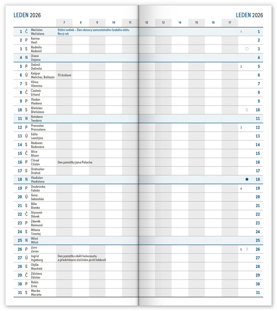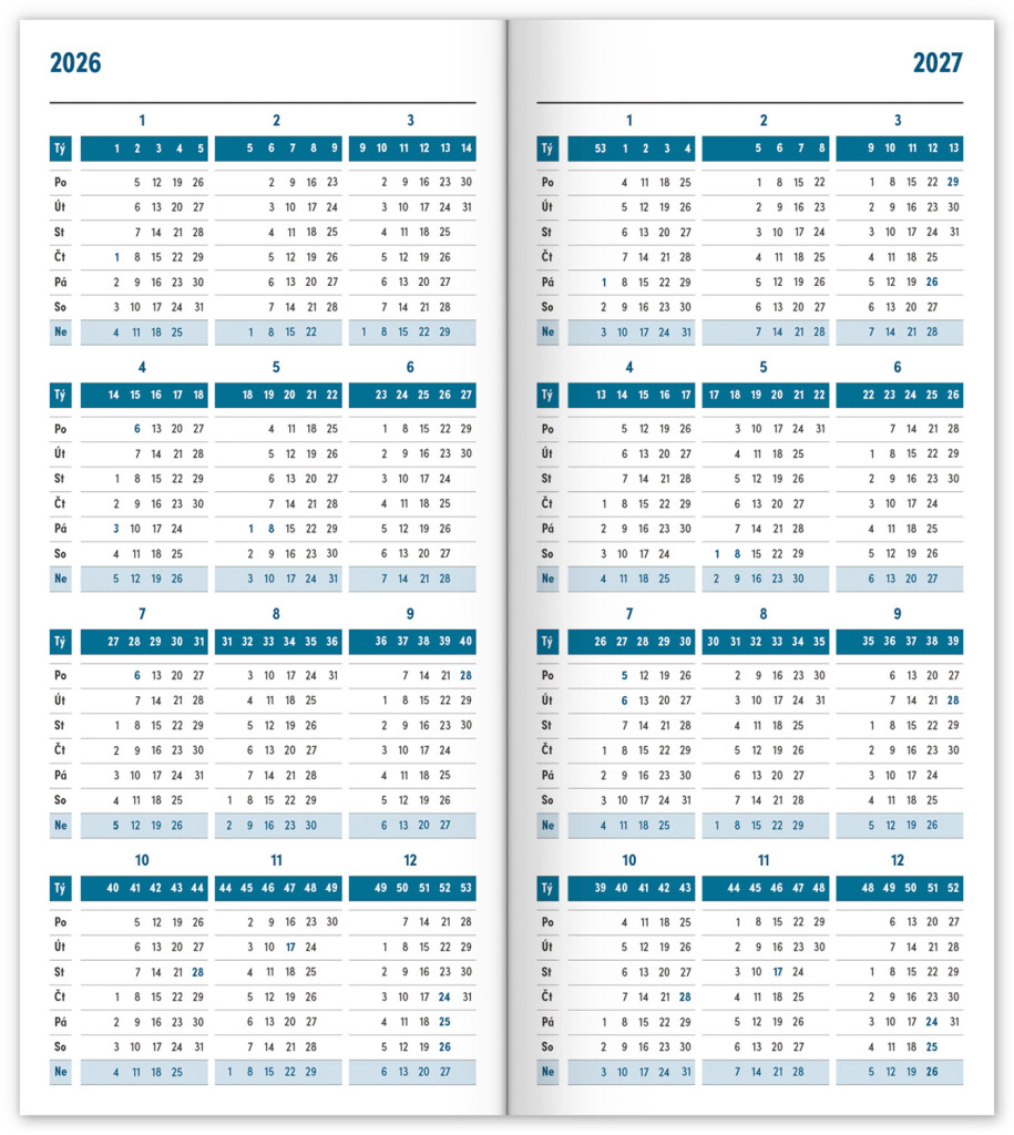 Praktický tenký diář s měsíčním rozložením se hodí opravdu kamkoli. Obsahuje český kalendář se jmény, svátky a památnými dny, pracovní kalendárium, jmenný seznam a přehled na roky 2026 a 2027.