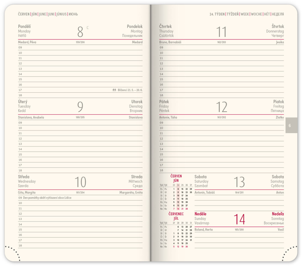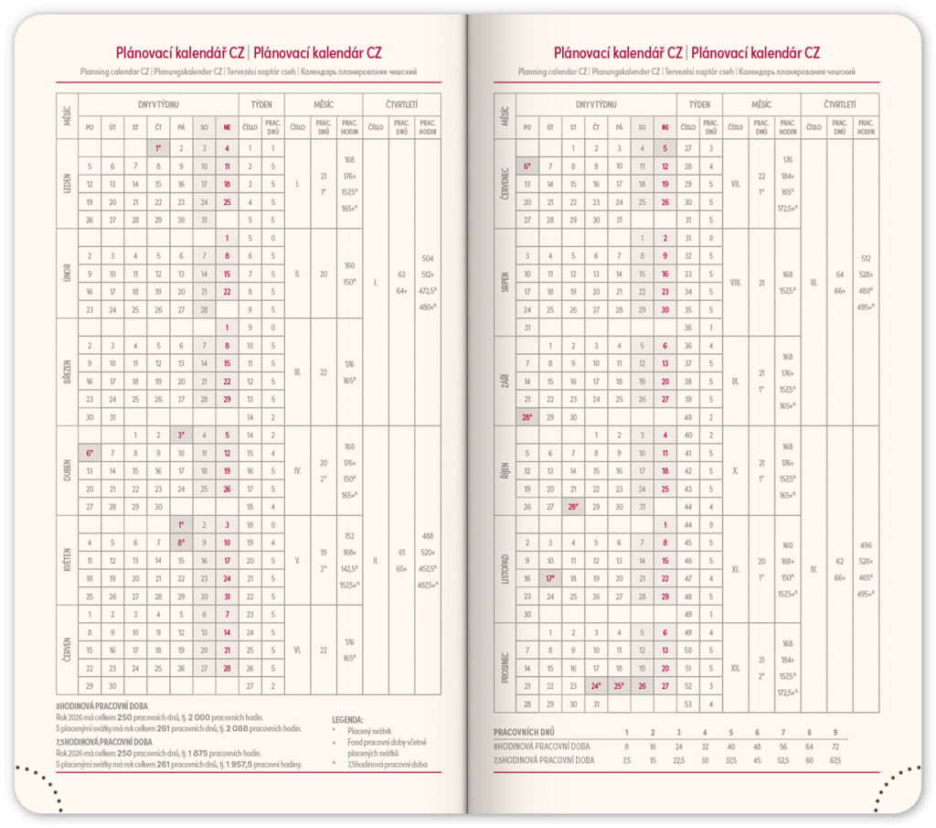 Nová řada diářů s výrazným letopočtem. Povrch má jemnou strukturu a je vhodný pro všechny typy ražby. Týdenní rozvržení s česko-slovenským kalendáriem a doplňkovým anglickým, německým, maďarským a ruským.