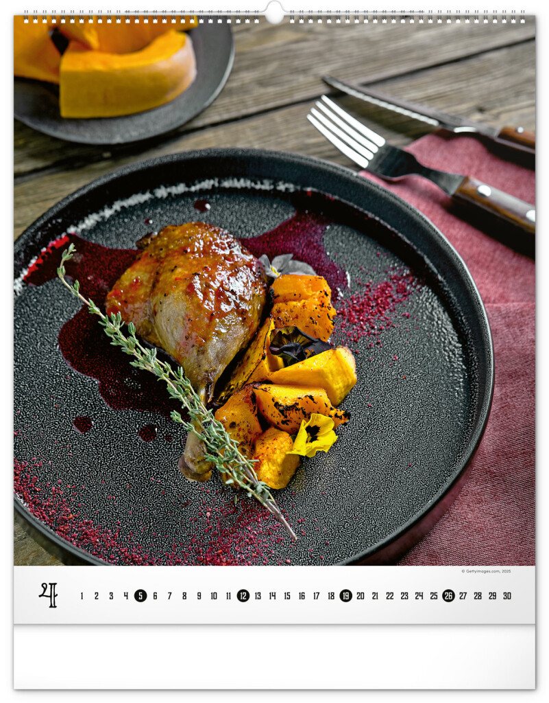 Velkoformátový kalendář z kolekce Platinum Collection obsahuje fotografie luxusních pokrmů, které budete chtít ochutnat. Šťavnaté steaky, křidélka i stehýnka nebo oku lahodící dezerty oživí interiér v každé kuchyni či jídelně. Kalendář zahrnuje jednoduché kalendářium.