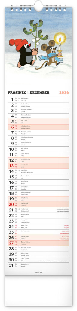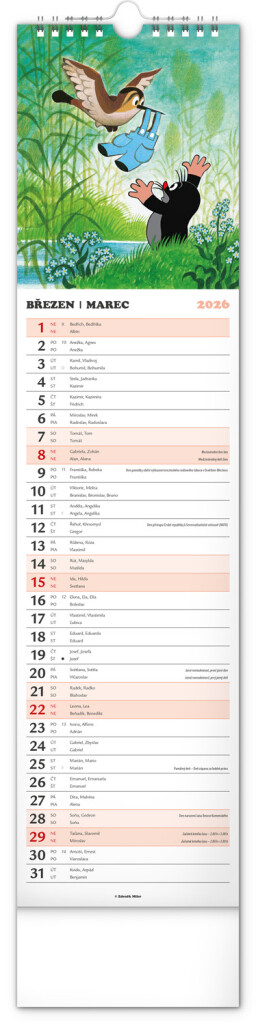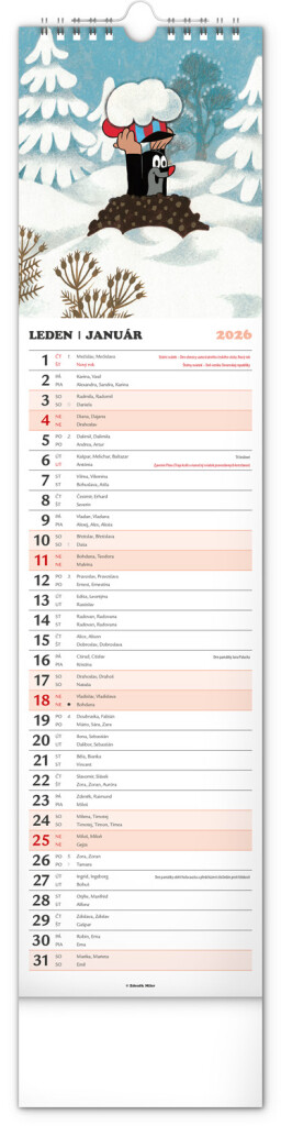 Praktický kravatový formát kalendáře s ilustracemi Zdeňka Milera. Ilustrace v kalendáři doplňuje české a slovenské kalendářium se jmény, svátky, památnými dny a fázemi měsíce. Každý den má prostor pro poznámky,...
