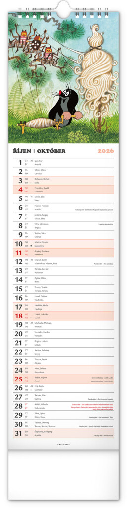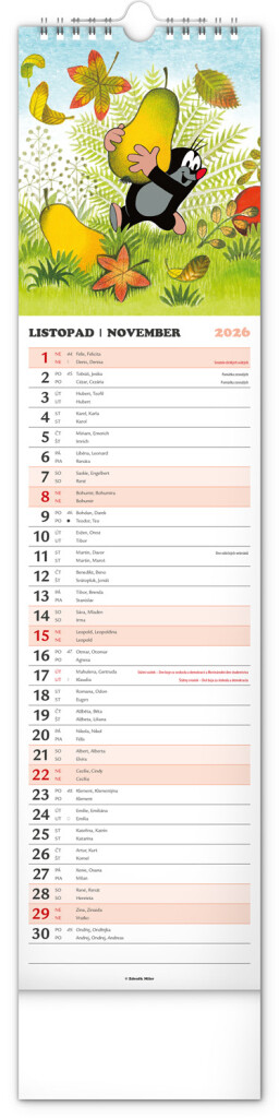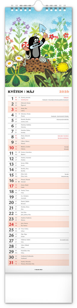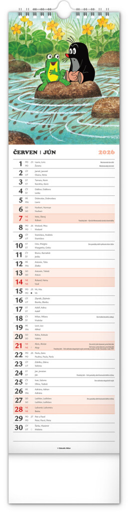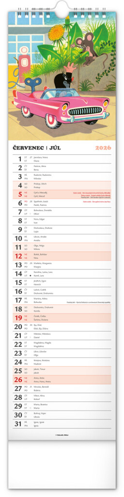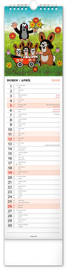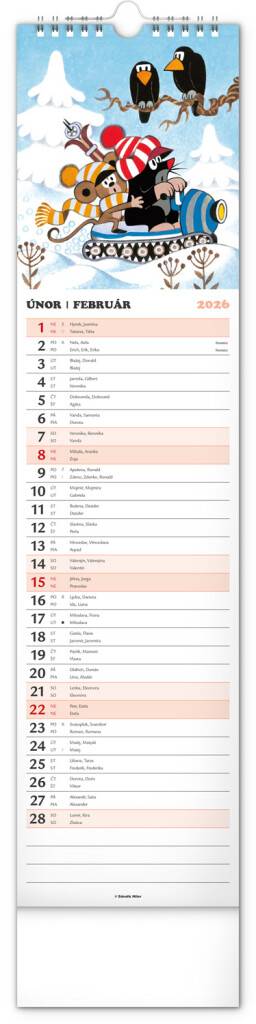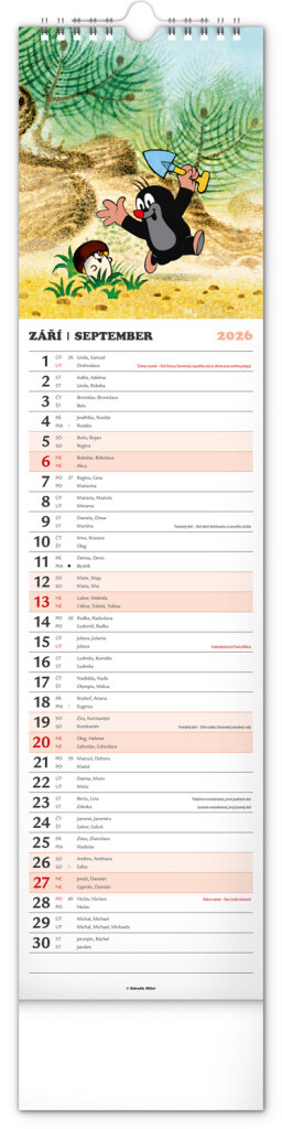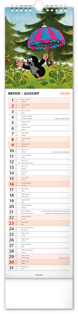 Praktický kravatový formát kalendáře s ilustracemi Zdeňka Milera. Ilustrace v kalendáři doplňuje české a slovenské kalendářium se jmény, svátky, památnými dny a fázemi měsíce. Každý den má prostor pro poznámky, víkendové dny jsou barevně odlišeny od pracovních.