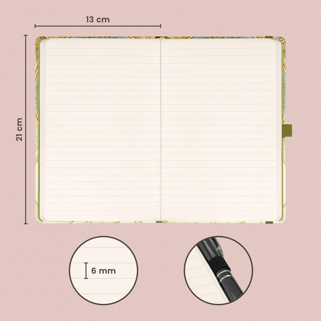 Vysoce kvalitní linkovaný zápisník z pevných desek s pružným uzávěrem, poutkem na tužku a vnitřní kapsou na drobnosti. Uvnitř najdete 172 tečkovaných stran na žlutém papíře pro zapisování všech vašich nápadů. Linkovaný zápisník můžete používat jako deník, k zapisování hlubokých myšlenek nebo pracovních poznámek.