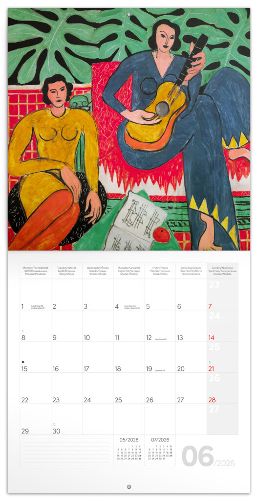 Objevte svět barev a tvarů jednoho z nejvýznamnějších umělců 20. století. Díla Henriho Matisse na stránkách poznámkového kalendáře potěší každého milovníka umění. Obsahuje přehledný kalendář od září 2025 do prosince 2026 v šesti jazycích, fáze měsíce, důležité svátky a prostor pro poznámky ke každému dni.
