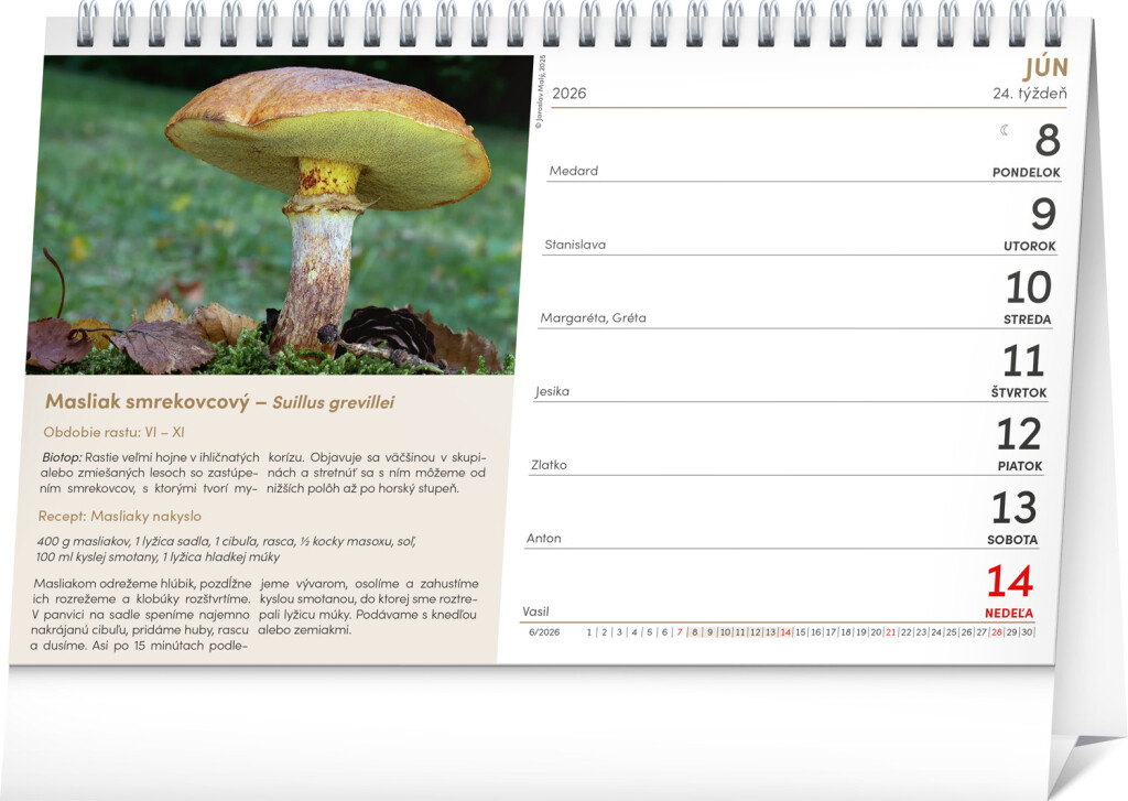 Houbařský kalendář je ideální pro všechny houbařské nadšence. Najdete v něm známé i méně známé druhy hub, popis jejich výskytu, kulinářského využití a zdravotních účinků. Texty a fotografie připravil odborník a mykolog Jaroslav Malý. Stolní kalendář s českým kalendáriem obsahuje svátky a památné dny, fáze Měsíce a přehled na celý rok.
