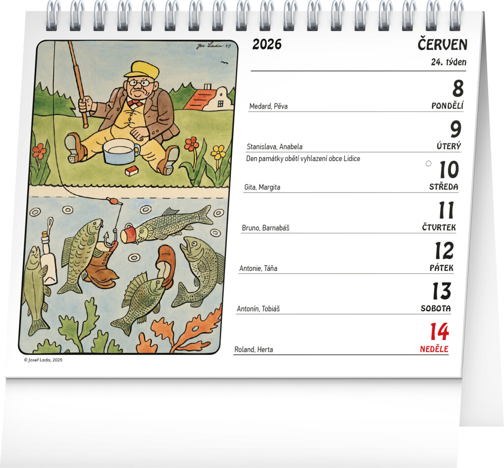 Týdenní stolní kalendář s lidovými ilustracemi Jozefa Lady je praktickým pomocníkem pro každý den. Kalendář obsahuje na každý týden jeden obrázek, kalendárium s českými názvy, svátky a památnými dny, fáze měsíce a přehled na celý rok.