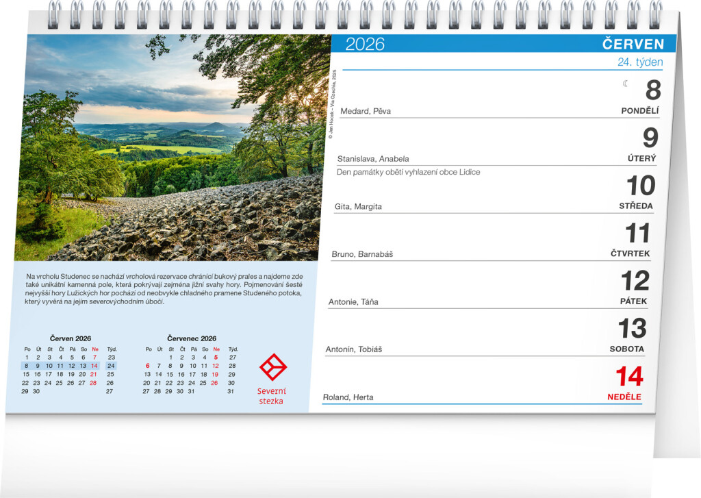 Trasy Via Czechia (severní, jižní, středomořská, střední, slezská a českomoravská) procházejí celou Českou republikou podél hranic a Středozemního moře, sledují většinou státní hranice a překonávají nejvyšší vrcholy většiny našich hor. Trasy v maximální možné míře kopírují krajinu a vedou k mnoha zajímavým místům v jednotlivých oblastech. Texty a fotografie: Jan Hocek. Stolní kalendář obsahuje kromě fotografií a textů také slovenský kalendář se jmény, svátky a památnými dny.
