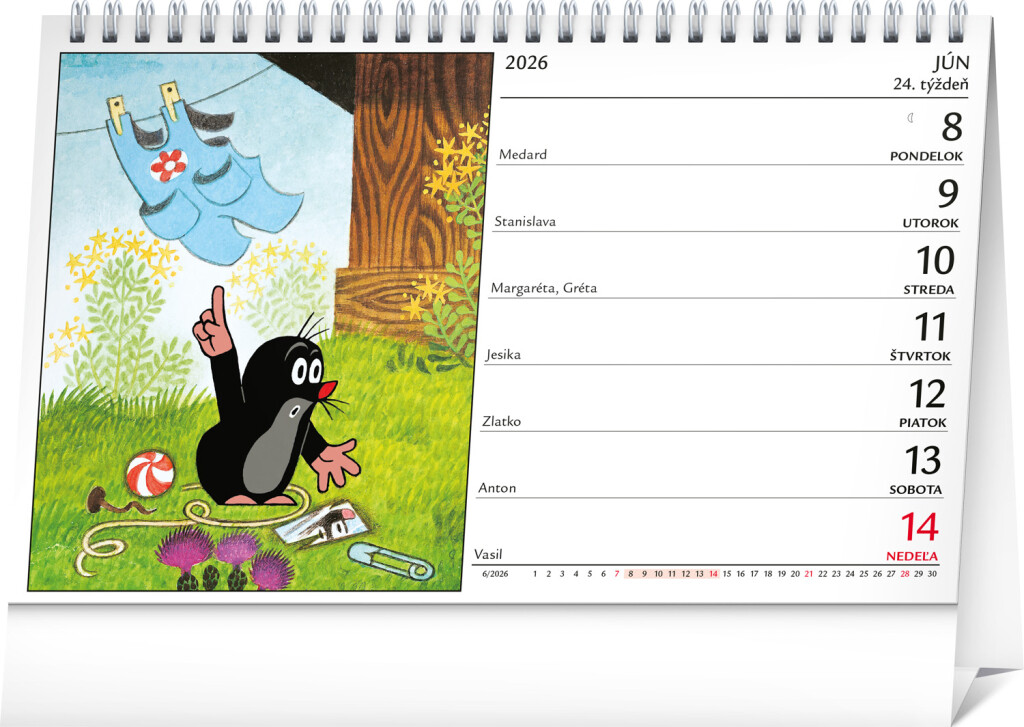 Krtkova dobrodružství jsme si v dětství přáli zažít snad všichni. Tento praktický stolní kalendář s ilustracemi Zdeňka Milera z oblíbených příběhů o Krtečkovi obsahuje na každý týden jeden obrázek, kalendárium se slovenskými názvy, svátky a památnými dny, fázemi Měsíce a přehledem na roky 2026 a 2027.