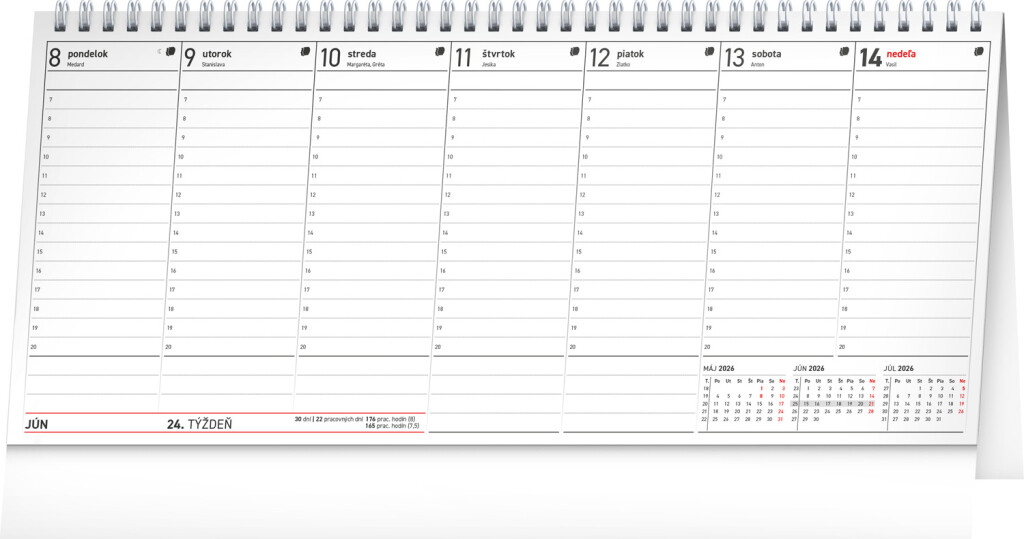 Stolní kalendář se sloupcovým kalendáriem obsahuje všechna daňová data, slovenské názvy, svátky a památné dny a tříměsíční přehled pro každý týden. S tímto kalendářem nezapomenete na žádnou schůzku nebo jednání a ještě vám zbude spousta místa na další poznámky a záznamy.
