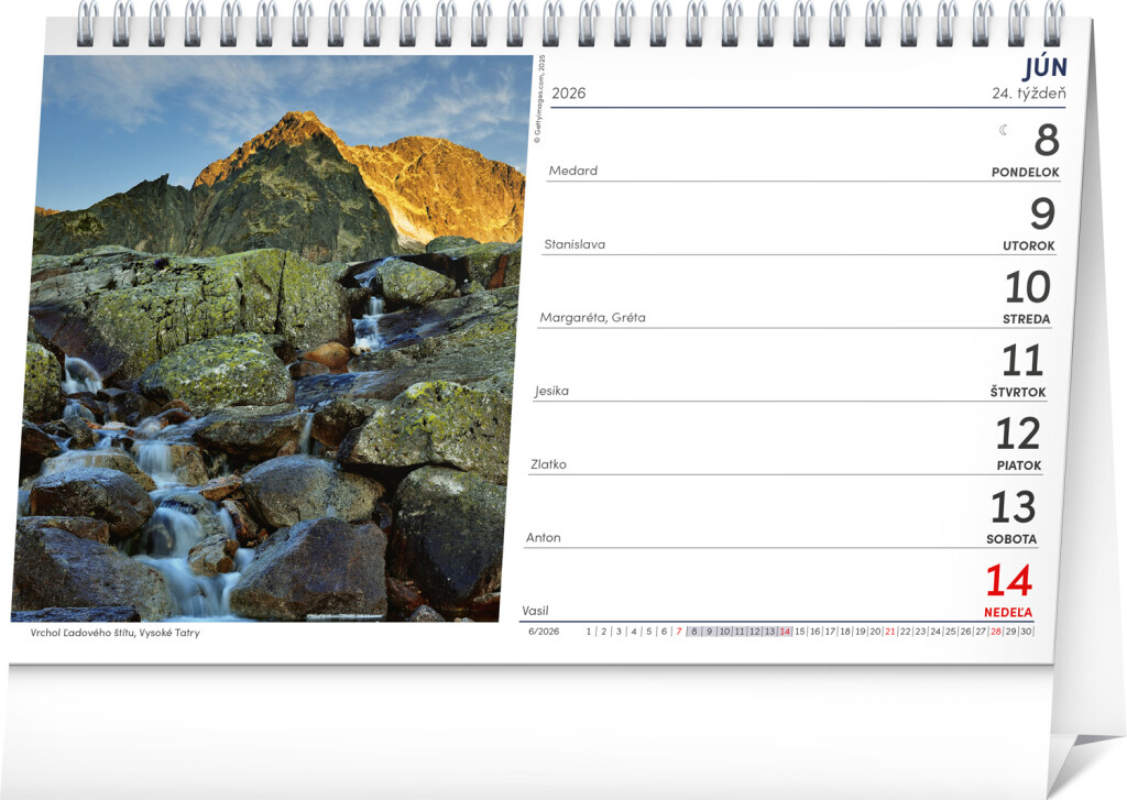 Stolní kalendář s nejmalebnějšími výhledy na krajinu na Slovensku. Fotografie jsou doplněny slovenským týdenním kalendáriem s názvy, svátky a památnými dny.