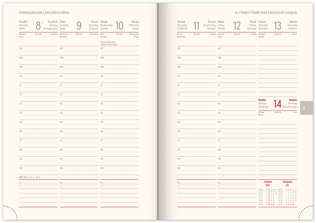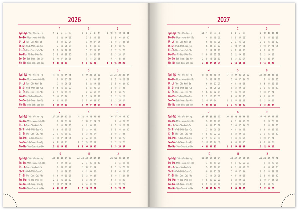 Nová řada diářů v moderním designu s pevnou gumičkou a poutkem na pero. Týdenní rozvržení s česko-slovenským kalendáriem a doplňkovými diáři v angličtině, němčině, maďarštině a ruštině.