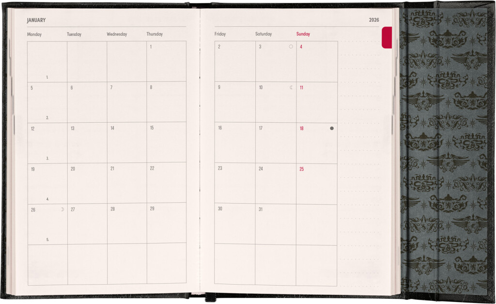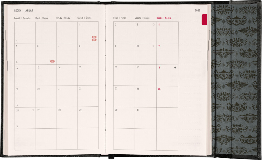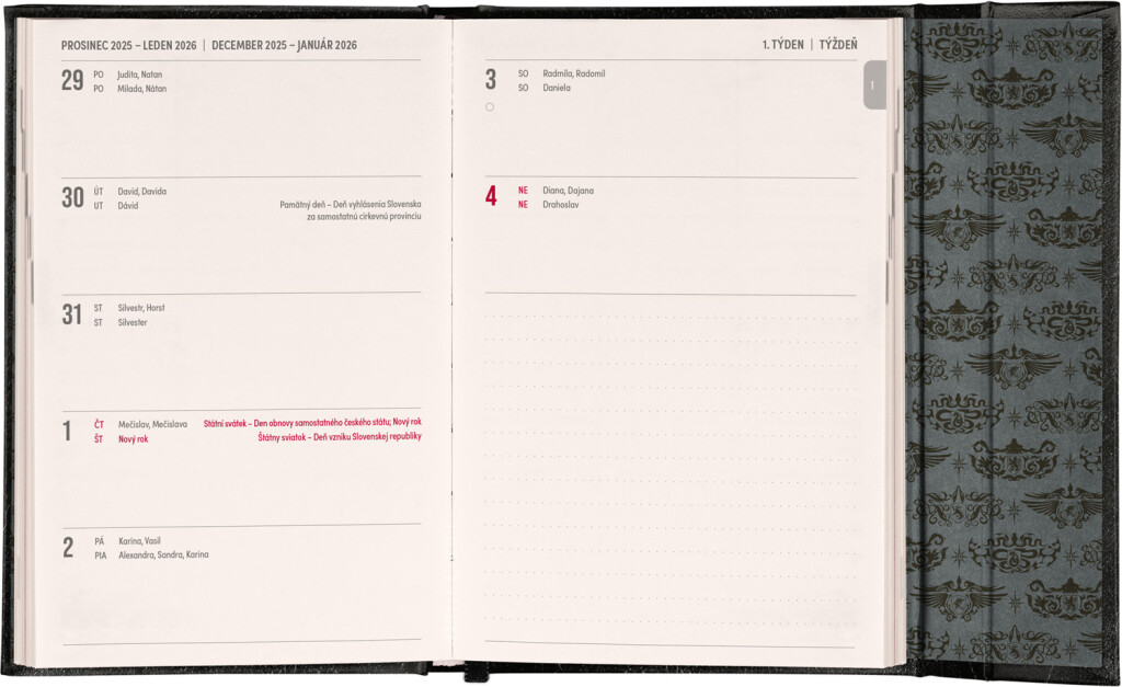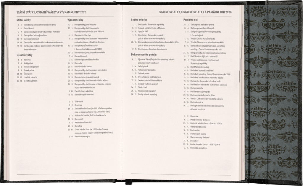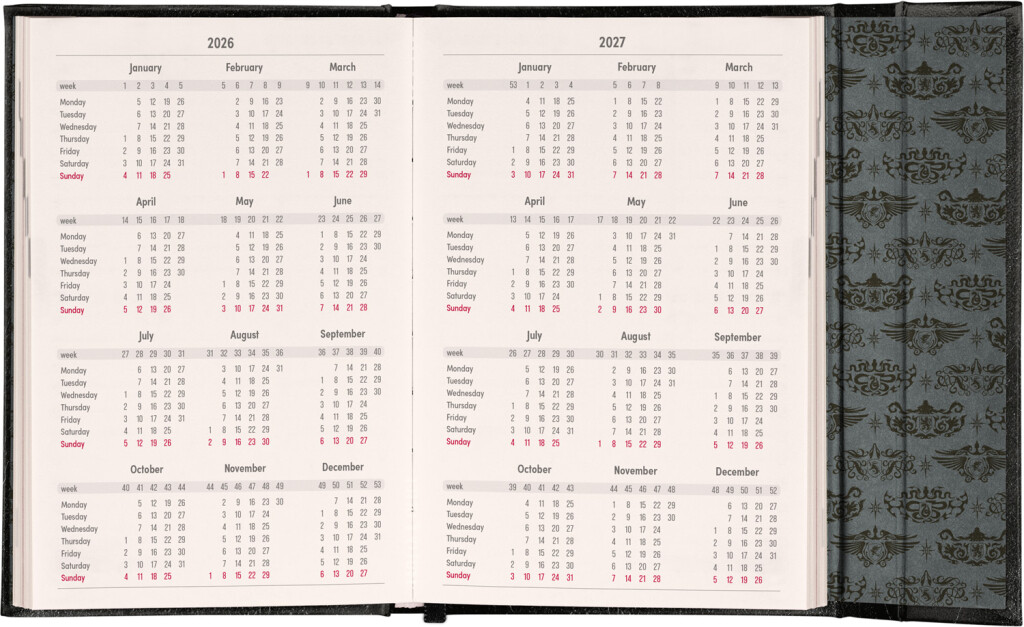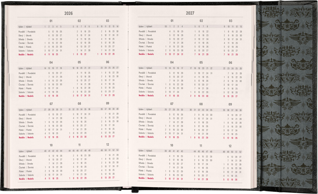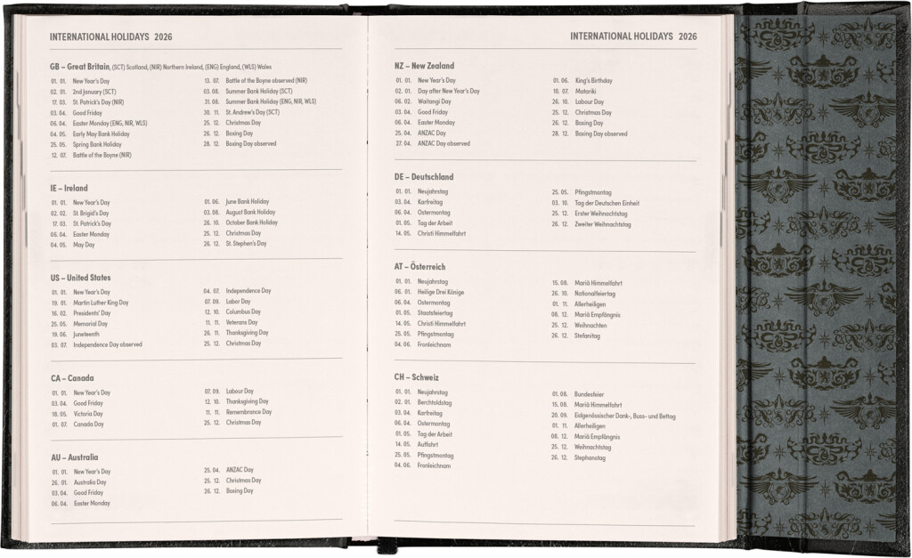Týdenní diář v angličtině s mezinárodními svátky a praktickým magnetickým uzávěrem je ideální volbou pro ty, kteří chtějí mít své plány přehledně pod kontrolou. Má horizontální uspořádání v týdenní verzi na dvou stranách s prostorem pro poznámky. Součástí jsou praktické měsíční přehledy, ideální pro plánování dovolené nebo prázdnin.