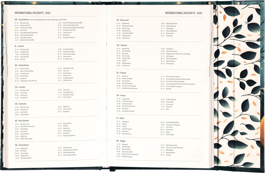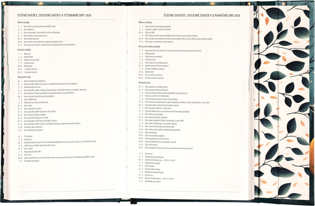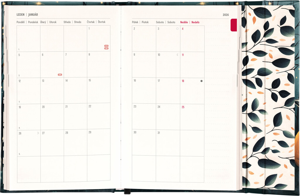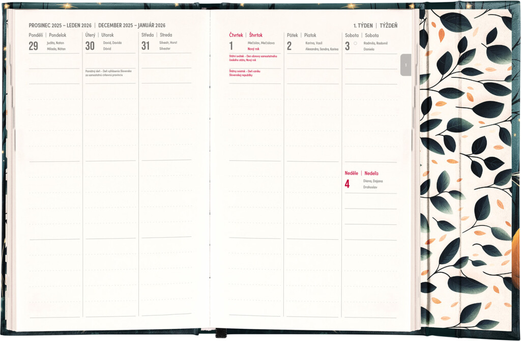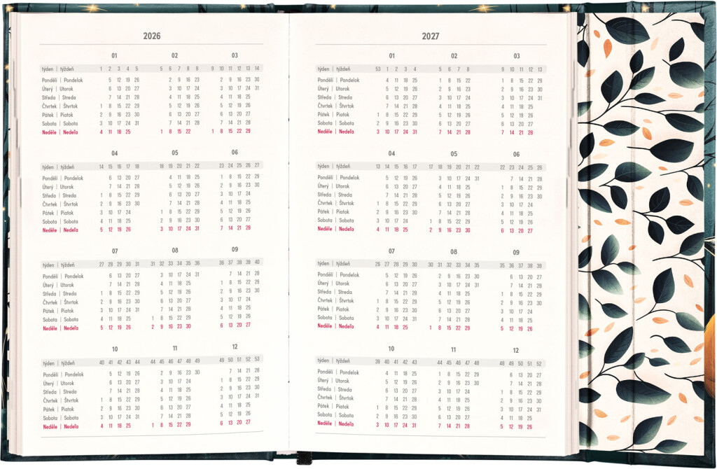 Týdenní diář v angličtině s mezinárodními svátky a praktickým magnetickým uzávěrem je ideální volbou pro ty, kteří chtějí mít své plány přehledně pod kontrolou. Nabízí sloupcové rozvržení jednotlivých týdnů s dostatkem prostoru pro denní poznámky. součástí jsou praktické měsíční přehledy, ideální pro plánování dovolené nebo prázdnin.