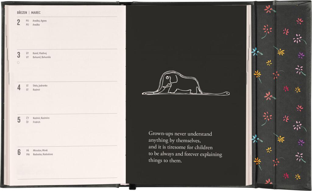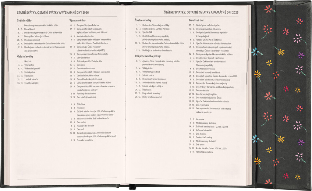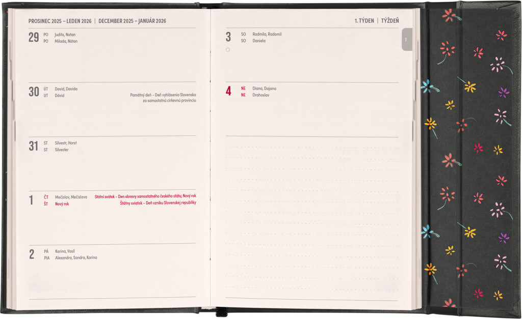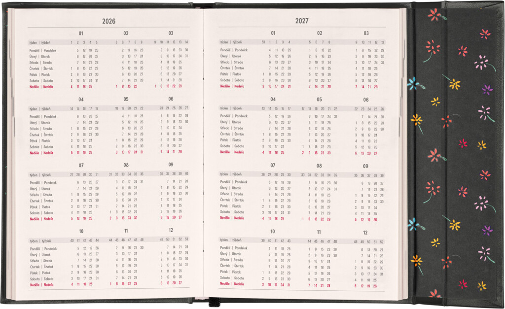 Týdenní diář s praktickým magnetickým uzávěrem je ideální volbou pro ty, kteří chtějí mít své plány přehledně pod kontrolou. Horizontální uspořádání s českým a slovenským kalendáriem v týdenním provedení na dvou stranách s prostorem pro poznámky. součástí jsou praktické měsíční přehledy, ideální pro plánování dovolené či prázdnin, a také seznam českých a slovenských svátků a jmenin.