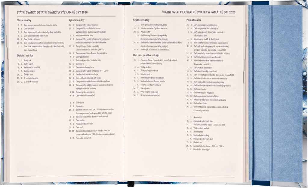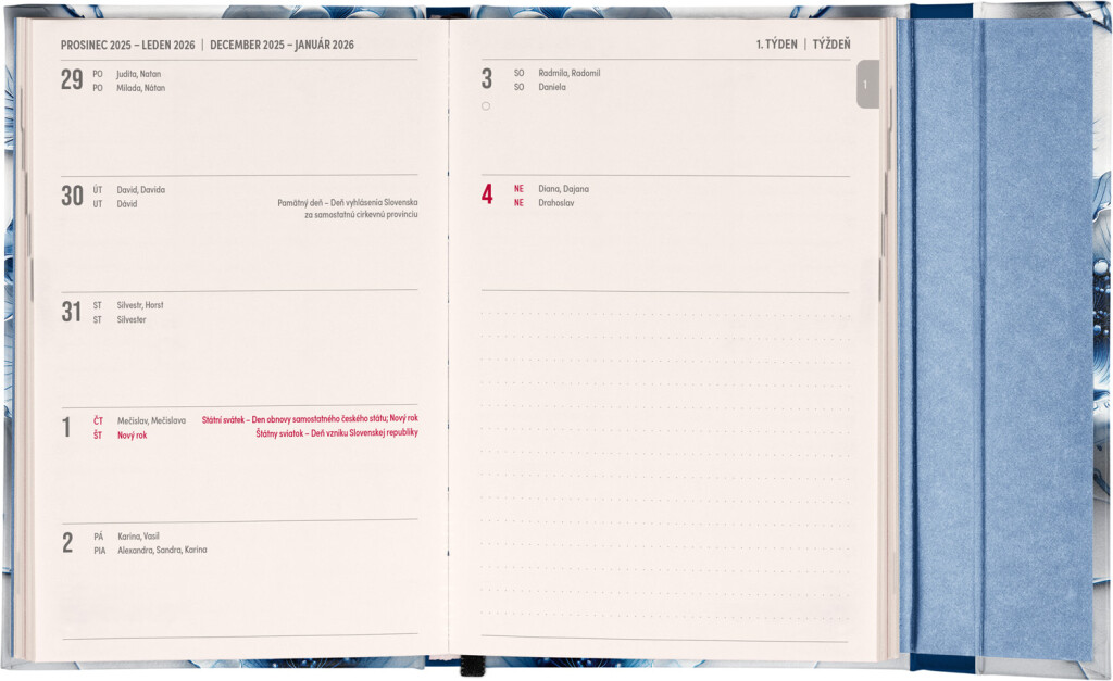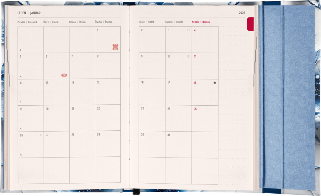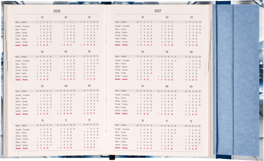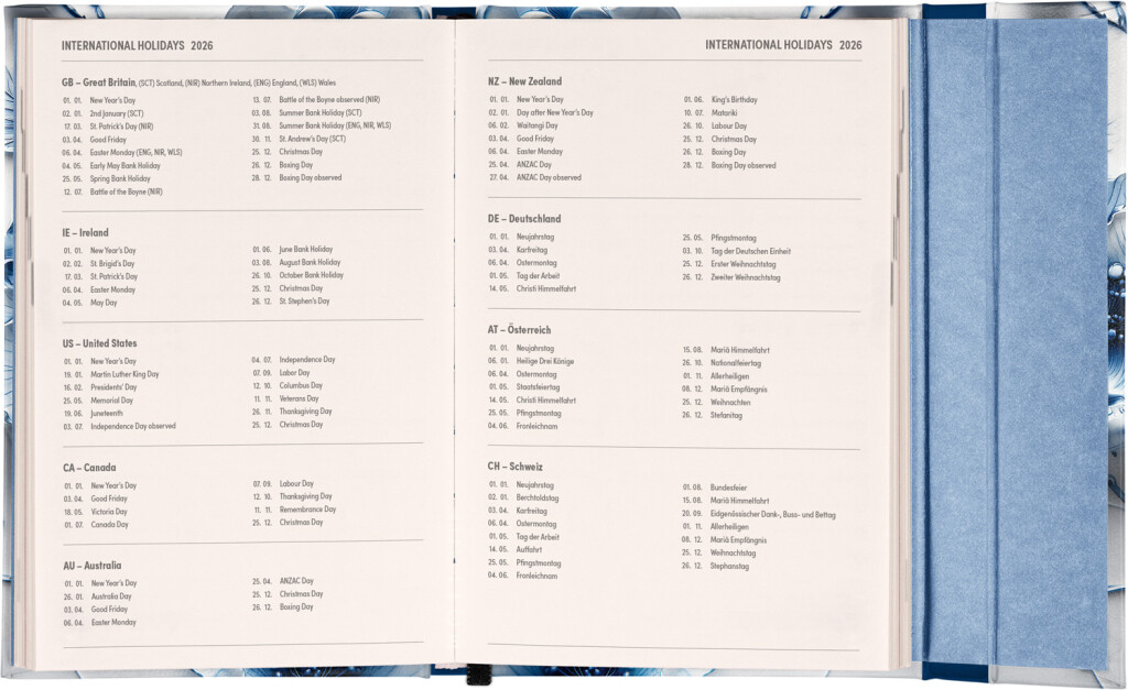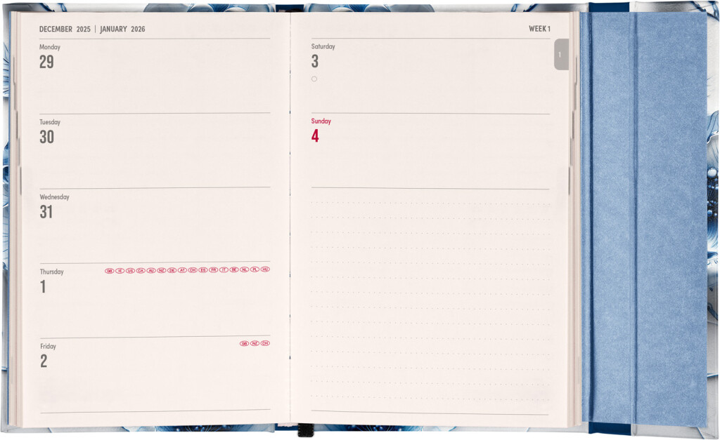 Týdenní diář v angličtině s mezinárodními svátky a praktickým magnetickým uzávěrem je ideální volbou pro ty, kteří chtějí mít své plány přehledně pod kontrolou. Má horizontální uspořádání v týdenní verzi na dvou stranách s prostorem pro poznámky. Součástí jsou praktické měsíční přehledy, ideální pro plánování dovolené nebo prázdnin.