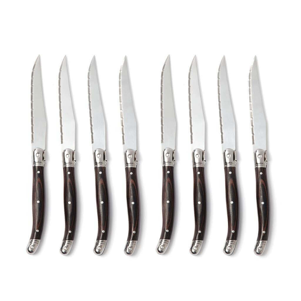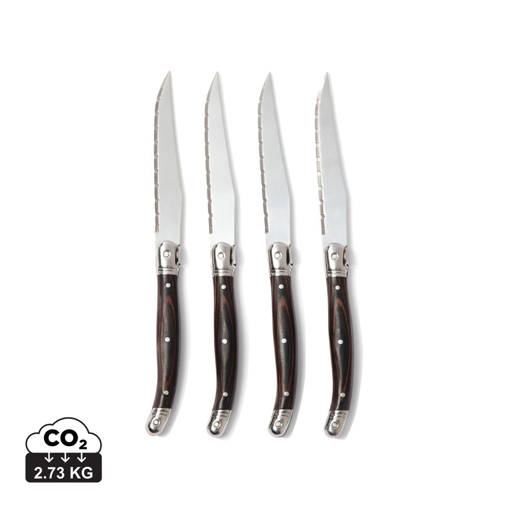 Vysoce kvalitní nože na maso v typickém bistro stylu inspirovaném Francií. Rukojeť z černého dřeva pakka a čepele z vysoce kvalitní nerezové oceli. Čepel má jemné zoubky, což umožňuje krájet potraviny s co nejmenším odporem. Sada čtyř nožů, které můžete snadno sladit s domácími vidličkami. Baleno v exkluzivní dárkové krabičce.