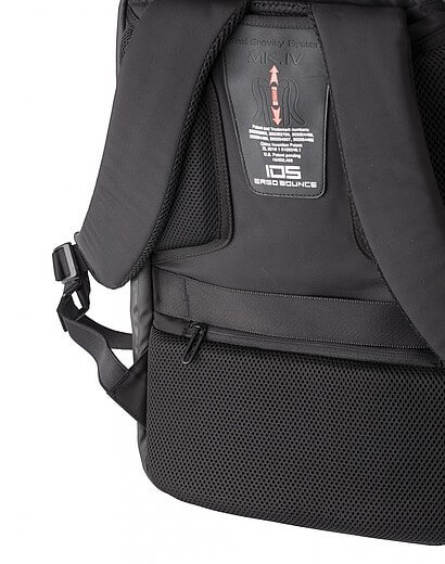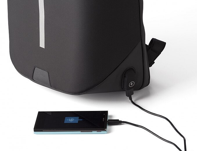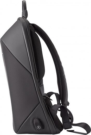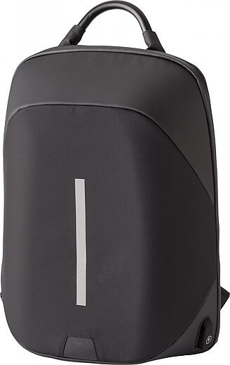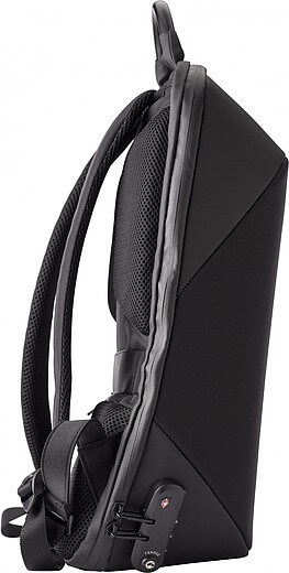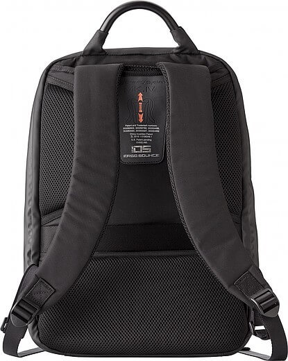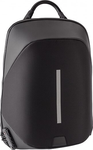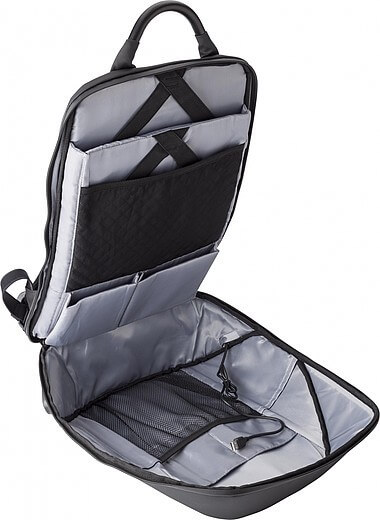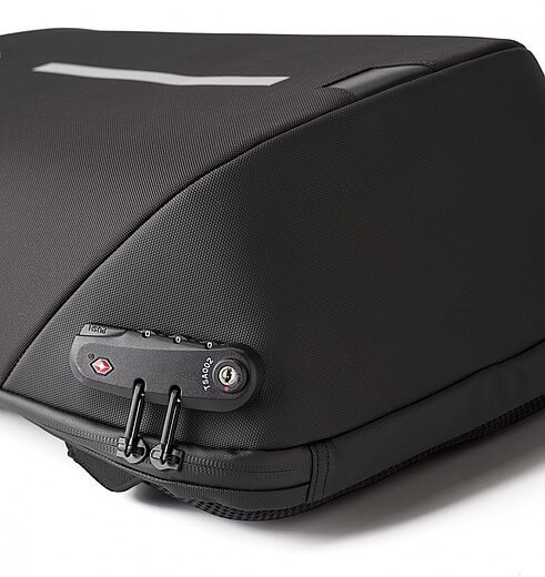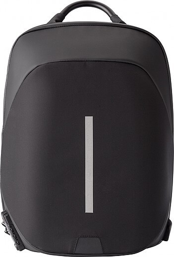 Nylonový (1200D) batoh s vnitřními kapsami, včetně polstrované přihrádky na laptop (15 palců). Polstrovaná záda a polstrované a nastavitelné ramenní popruhy. Třímístný kombinační zámek, USB port a kabel, reflexní proužek a speciální funkce snížení hmotnosti.