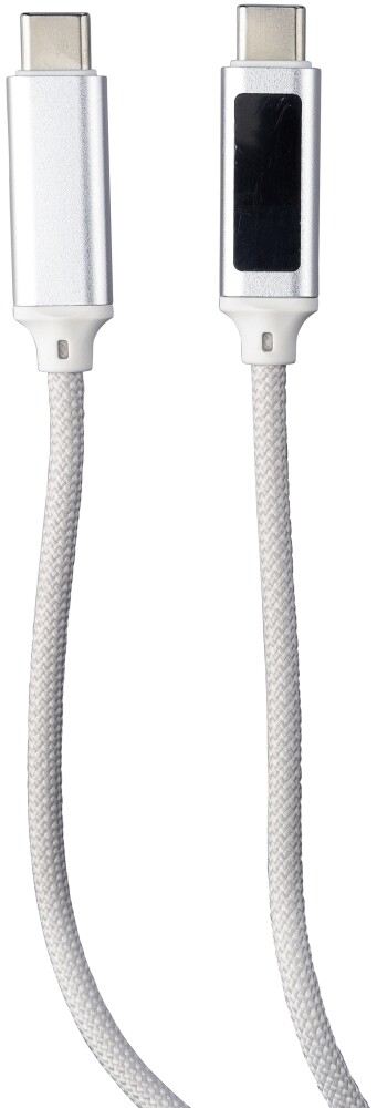 Nylonový nabíjecí kabel s hliníkovými zdířkami. USB-C na USB-C. Kapacita: 100 W. Modrá kontrolka indikace rychlosti nabíjení na jedné zásuvce. Jednotlivě baleno v hnědé kartonové krabici. Rychlost přenosu dat 480 Mbps. Materiál: nylon. Rozměry: 1,2 x 100 cm