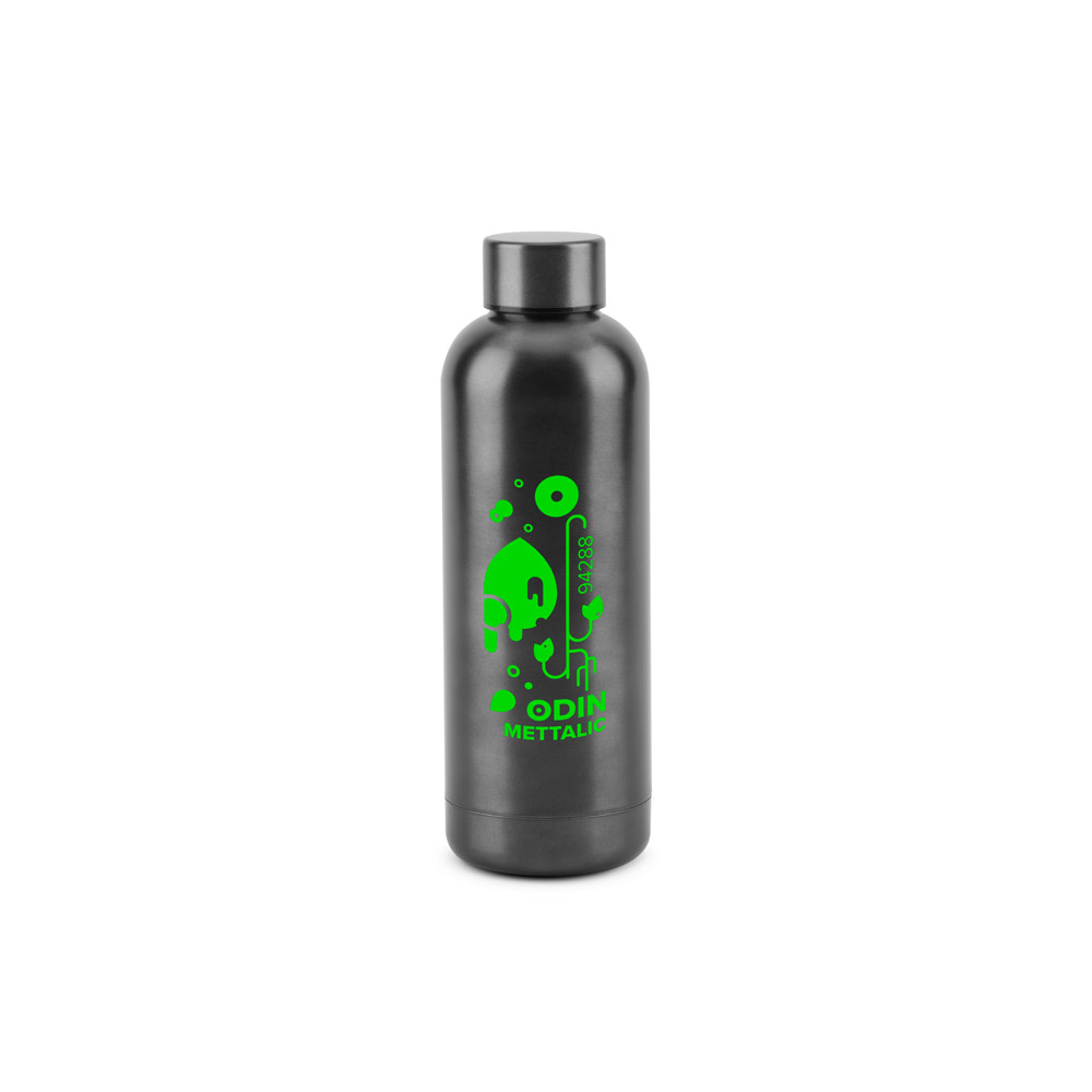 Láhev z nerezavějící oceli (90% recyklovaná) s uzávěrem z nerezavějící oceli. Kovová povrchová úprava a vakuově izolovaná dvojitá stěna. Kapacita až 550 ml. Dodáváno v dárkové krabičce z kraftového papíru. ø73 x 222 mm