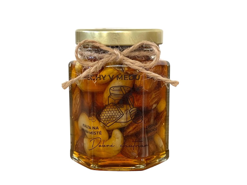 Vybíráno kešu WW320 z Afriky a natural mandle z USA ve 100% českém včelím medu z farmy Rokytník. Med bez přidaného glukózového sirupu, oříšky vysoké kvality. Výborná kombinace přírodní sladkosti a chuti. Skladujte na tmavém, suchém a chladném místě. Váha: 130g.