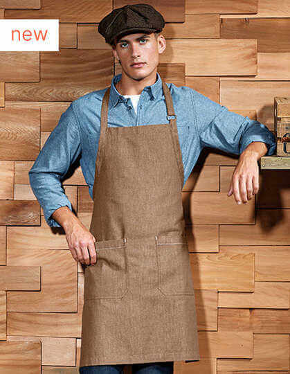 100 % kepr z organické bavlny | Bavlna s certifikací Fairtrade | 80 cm dlouhá x 72 cm široká se 107 cm dlouhými šňůrkami | Dvě kapsy o rozměrech 20 cm x 19,5 cm široké, s kontrastním ozdobným prošíváním | Kovová spona z retro mosazi / červené mosazi na krku pro nastavení výšky