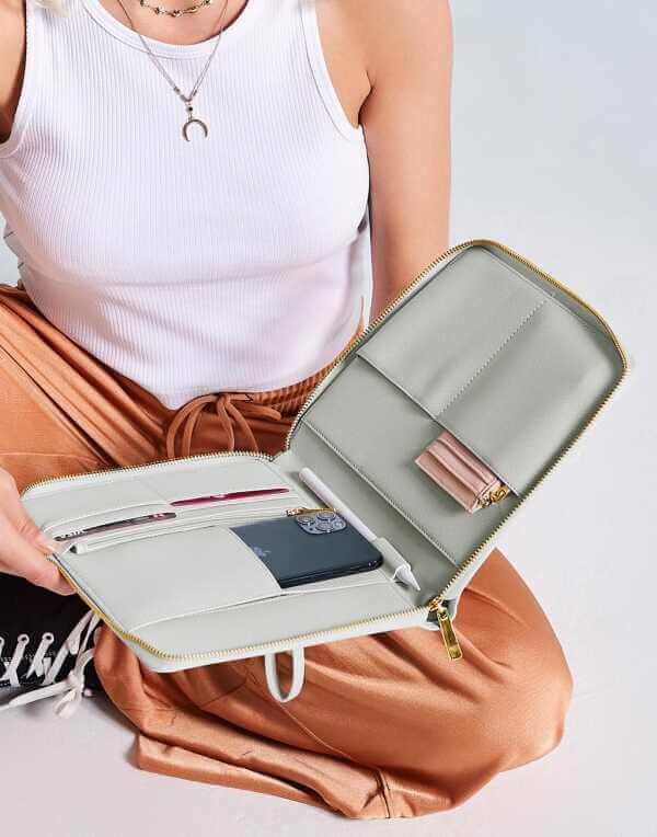 · 100% Polyurethane (Leather-look) · jemný materiál Saffiano · měkká podšívka · hlavní přihrádka na zip · několik vnitřních kapes · prostor na 6 kreditních karet · kompatibilní s iPad mini / tabletům · odtržitelná štítek · rozměry: 20 x 23 cm · max . plocha tisku: 17 x 20 cm