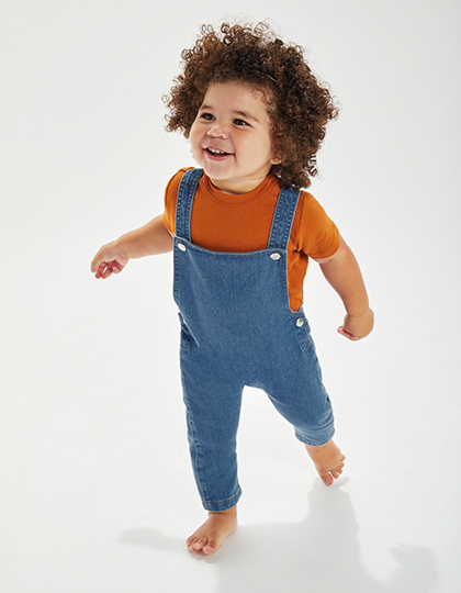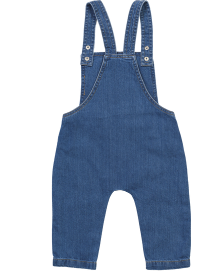 Organická bavlna nebo přechod na organickou bavlnu | Denim 9oz | Popruhy s nastavitelným zapínáním na patentky | Vyšší zadní část | Bez středového švu na přední a zadní části těla | Snížený rozkrok | Zapínání na patentky na bocích | Prošívání v džínovém stylu | Rovné spodní lemy | Odtrhávací štítek.