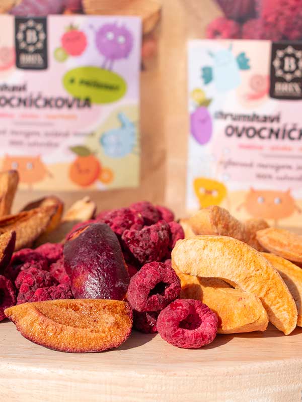 Složení: lyofilizované švestky 38 %, meruňky 37 %, maliny 25 %.