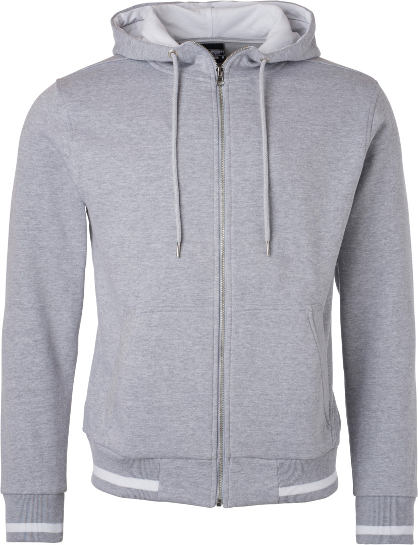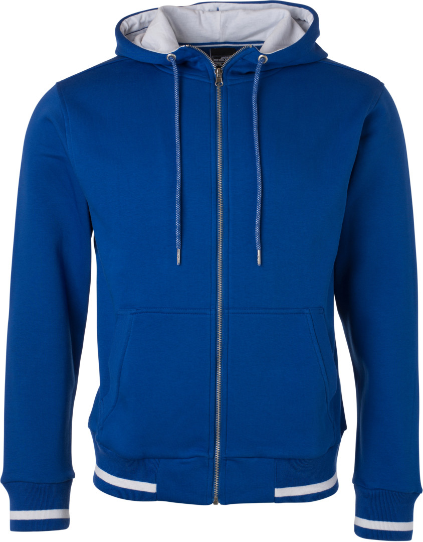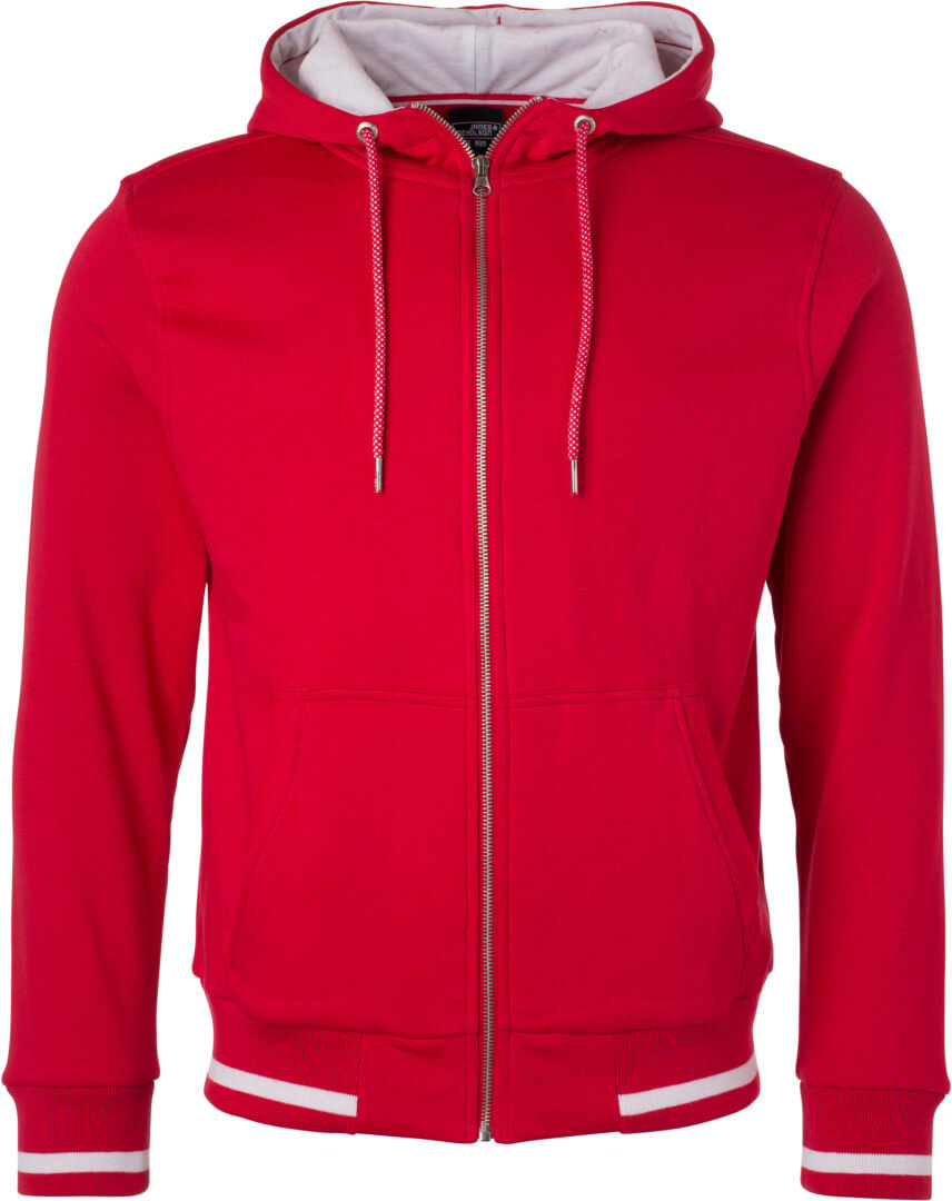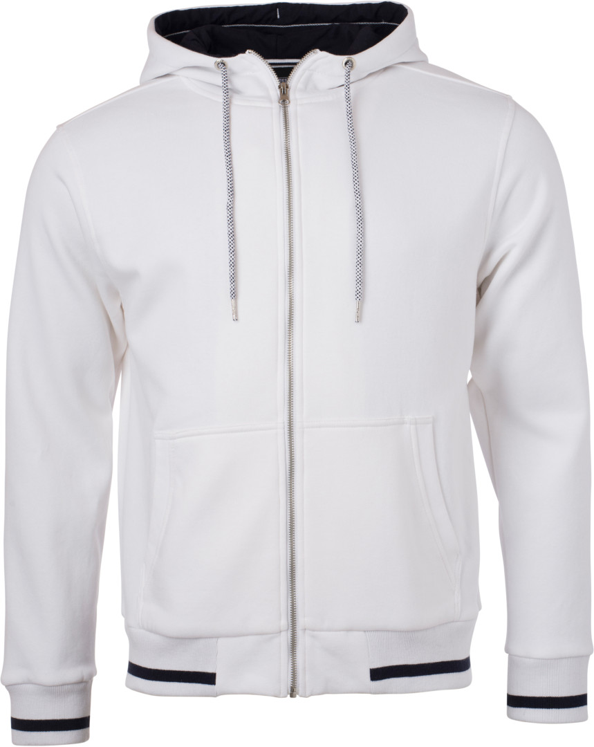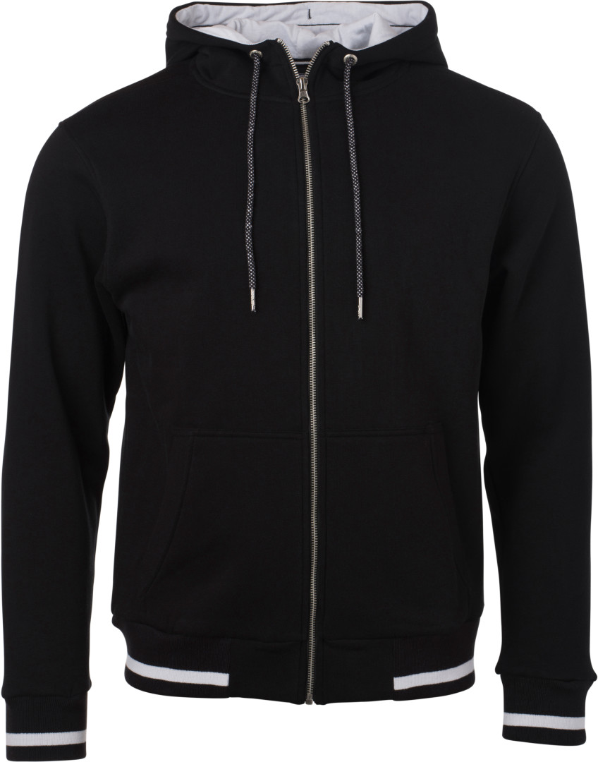 300g/m², 80% bavlna, 20% polyester Dvouvrstvá kapuce uvnitř v kontrastní barvě, pletené manžety s elastanem, kontrastní pruhy v pase a na manžetách, klokaní kapsa, kovový zip YKK, uvnitř zdrsněná