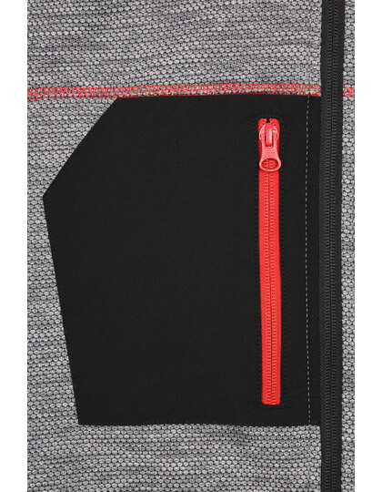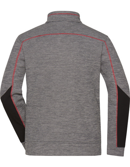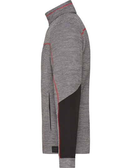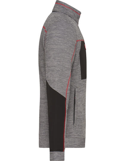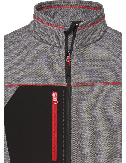 Pletená flísová bunda se snadnou údržbou | Měkká, teplá, snadno udržovatelná látka v melanžovém vzhledu | Vnější strana: Hladký, texturovaný vzhled | Vnitřní strana: Měkký, načechraný a česaný materiál | Dvě boční kapsy se skrytým zipem, dvě vnitřní kapsy | Náprsní kapsa z tkané látky s kontrastním zipem | Kontrastní šití | Stojáček | Po celé délce skrytý zip s ochranou brady | Zipy: YKK
