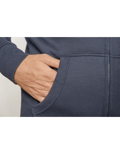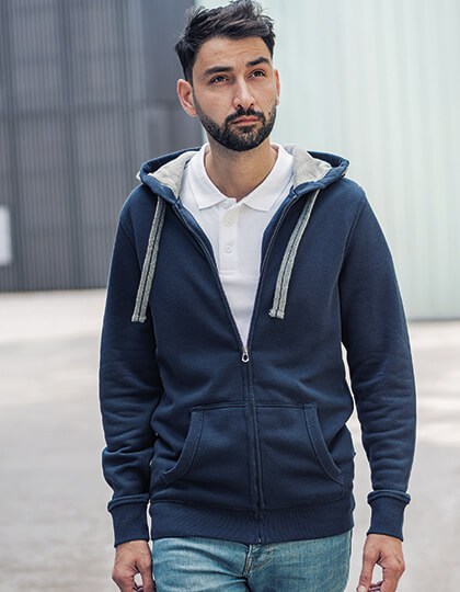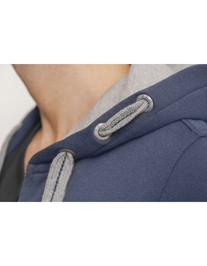 Vyrobeno ze zvláště měkké smíšené textilie z 80% bavlny a 20% polyesteru. Módní moderní slim fit střih. Uvnitř kartáčovaný. Kapuce s kontrastní podšívkou. Plochá, vyšívaná kontrastní stahovací šňůrka se středem. 3 kovové poutka HRM na každé straně.