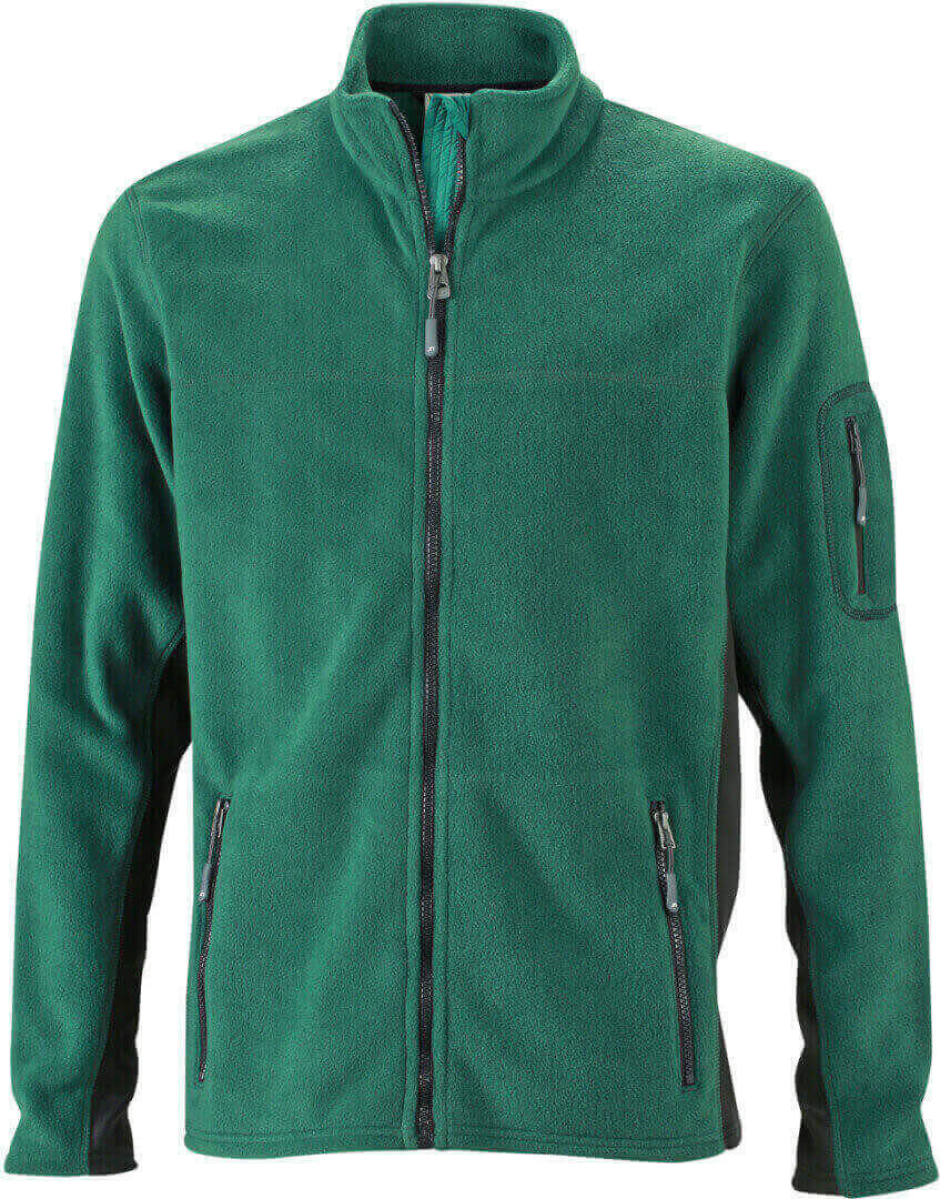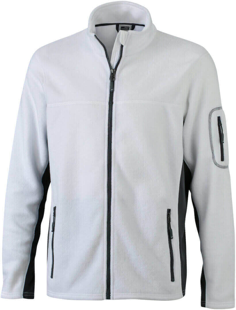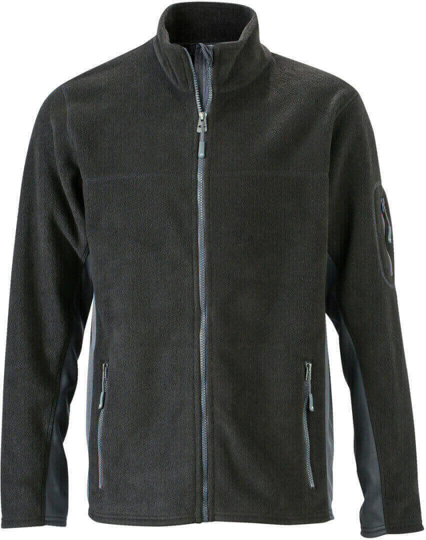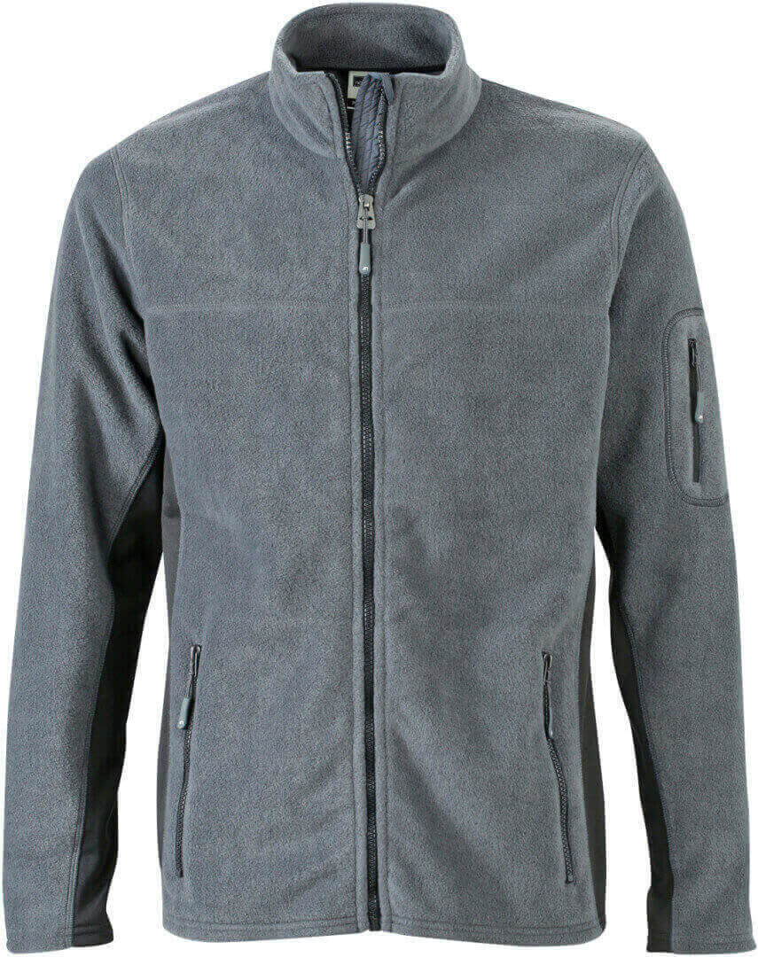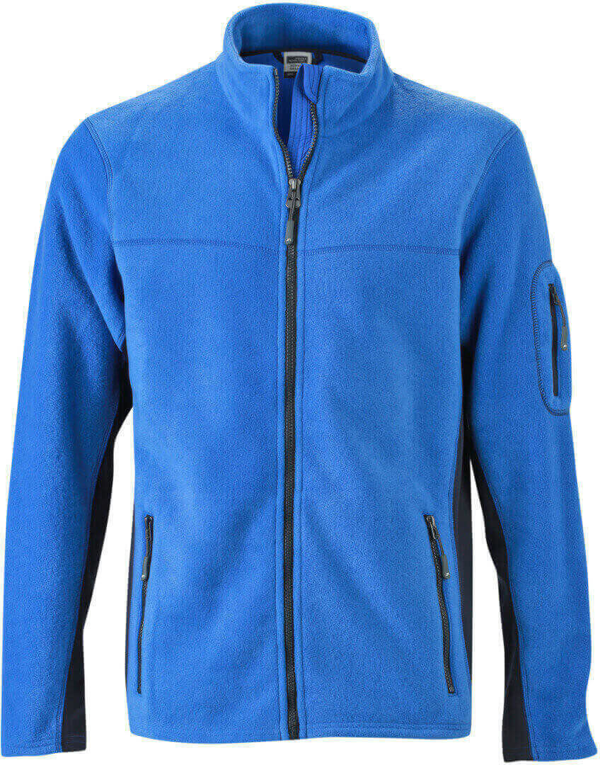 280g/m², 100% polyester stojáčkek, 2 boční kapsy na zip, kapsa na rukávu, přední zip s ochranou na bradu, na rukávech a bocích elastické panely v kontrastní barvě, vyrobena z příjemného teplého materiálu, který je nenáročný na údržbu