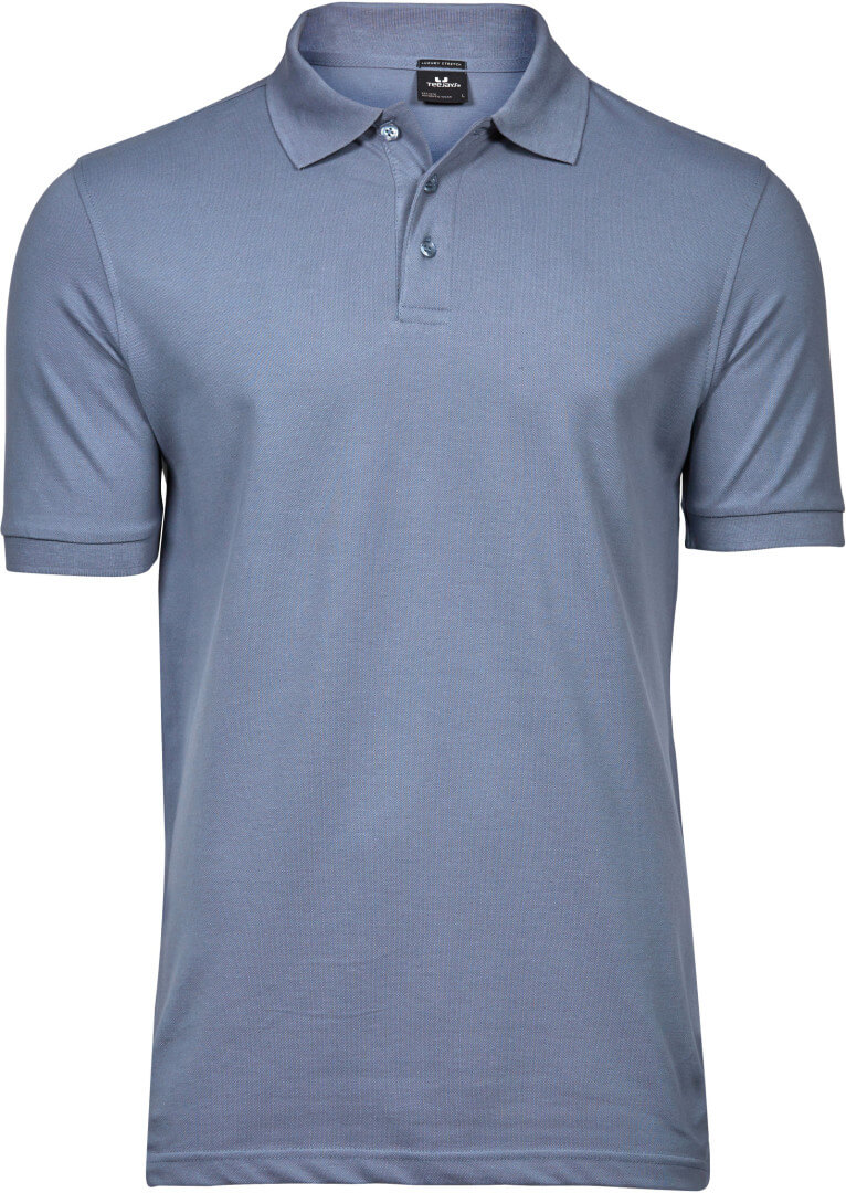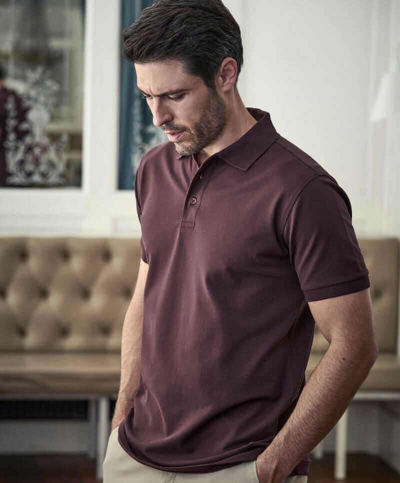215g/m², 95% předepraná bavlna, 5% elastan lehce vypasovaný střih, pletený límeček s Lycra®, zesílená léga s 3 knoflíky tón v tónu, dvojitě prošitá ramena, rukávy a lem, lemovka u krku, žebrový úplet na manžetách rukávu, boční rozparky, lze prát na 40°