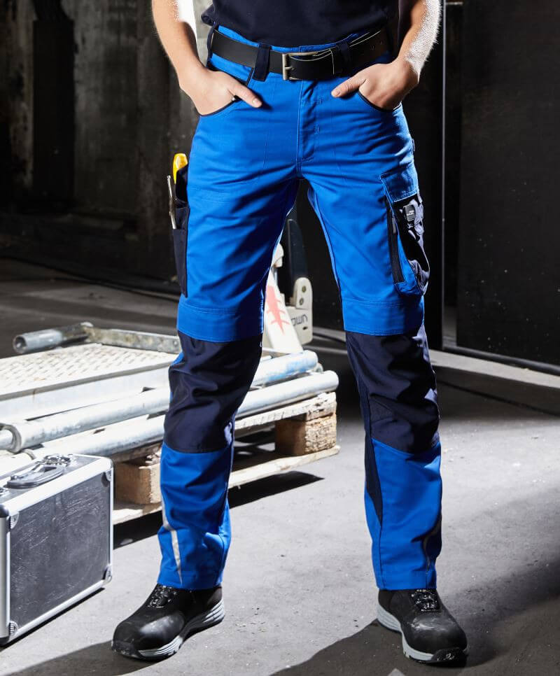 Pánské pracovní kalhoty, slim fit střih, elastický pás s poutky, zipy YKK, několik kapes na nářadí, kapsy na kolena vyztužené Cordura®, 2 kapsy na zip, kapsa na mobil, kapsa na pravítko, kapsa na pera, odolný proti roztržení, 3x prošívané švy, robustní a odolné, elastické, reflexní prvky (bez ochranné funkce), doporučené prát na 60 °, vhodné i pro sušení v sušičce.