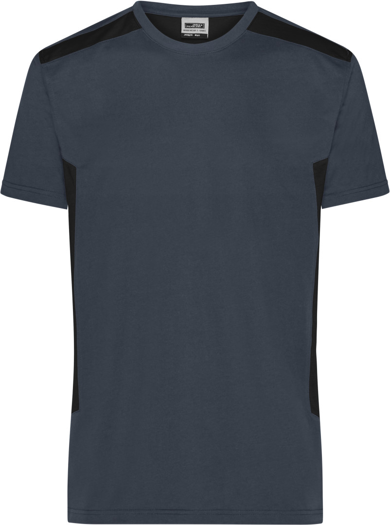 Pánské pracovní tričko s kulatým výstřihem a elastanem, pásek na krk, vsadky v kontrastní barvě na boku a rameni, odolné. Doporučené prát na 60 °. Vhodné pro sušení v sušičce. Vyrobeno z 50% organické bavlny a 50% recyklovaného polyesteru.