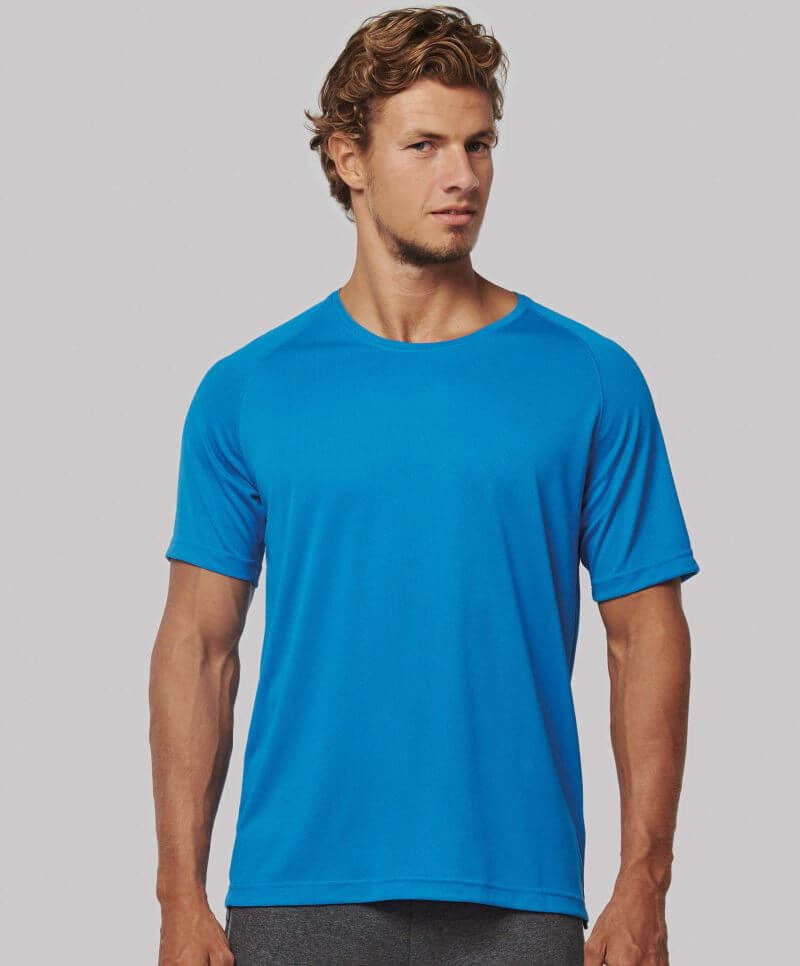 Pánské sportovní tričko s rovným střihem, kulatý výstřih, vnitřní nákrčník v kontrastní barvě, raglánové rukávy, dvojité švy na kulatém výstřihu, rychlé schnutí, štítek Tear Away. Vyrobeno ze 100% recyklovaného polyesteru.