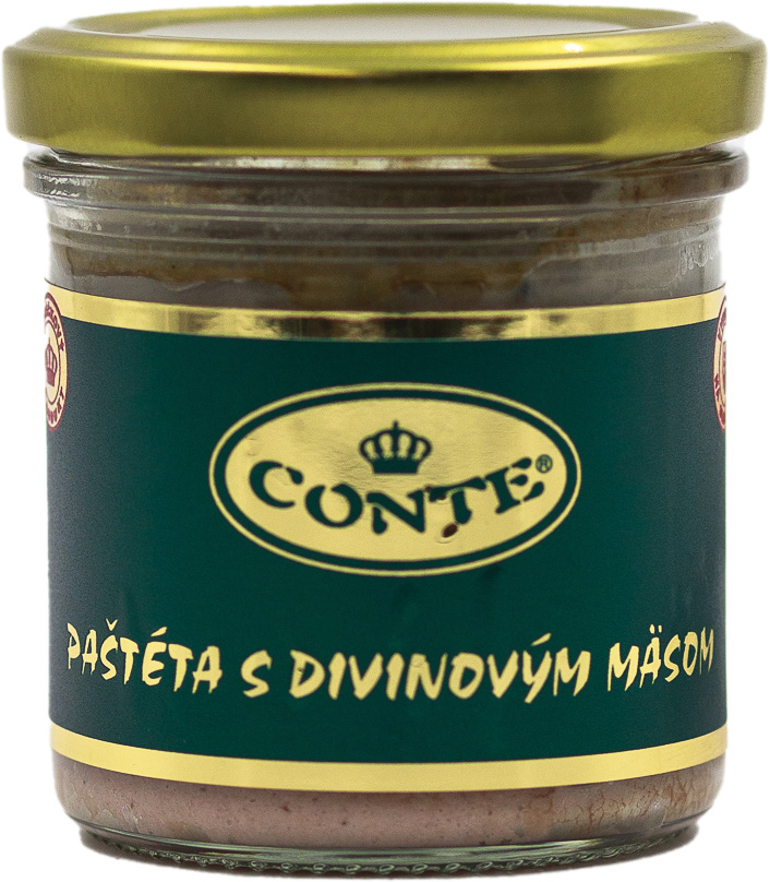 Paštika se zvěřinou NATUR - jemná sterilovaná paštika ve skle z 35 % vepřových jater, 30 % slaniny a 20 % zvěřiny. Dochuceno vývarem, solí a přírodním kořením. Bez éček.