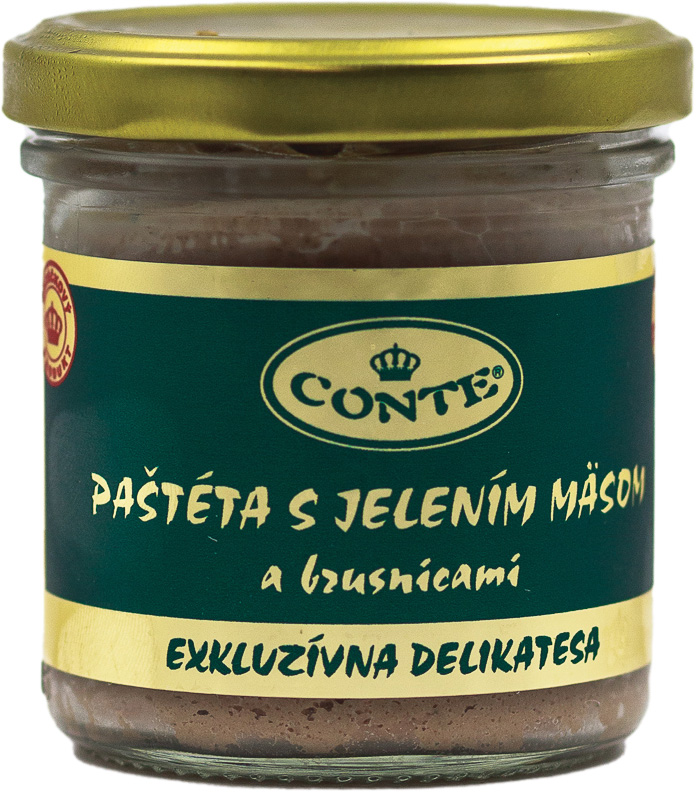 Jelení paštika s brusinkami - jemná paštika vyrobená z 30 % jater, 30 % slaniny a 20 % jeleního masa, doplněná brusinkami, kukuřičným škrobem, přírodním kořením, vodou a solí. Sterilizovaná, bez etických příznaků.
