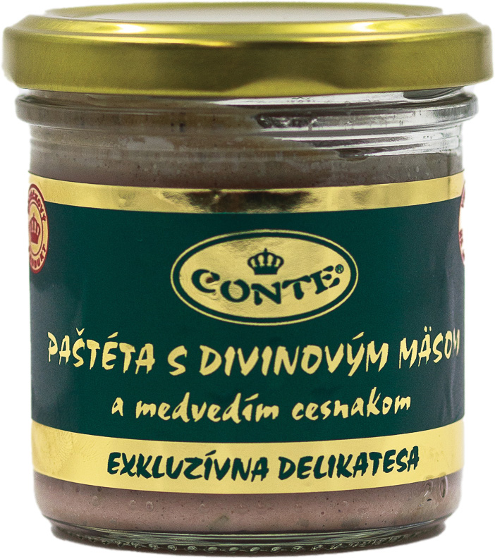 Paštika se zvěřinou a medvědím česnekem - lahodná paštika z 35 % vepřových jater, 30 % slaniny a 20 % zvěřiny, obohacená medvědím česnekem, vývarem, solí a kořením. Bez éček.