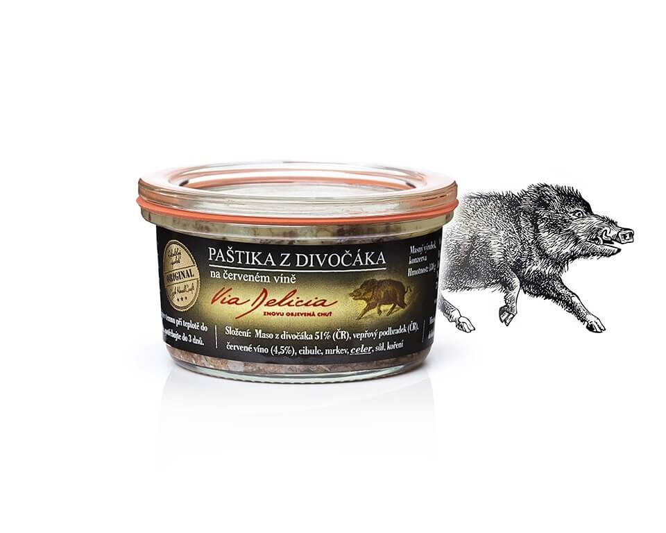Paštika z divočáka na červeném víně Via Delicia je pravá zvěřinová delikatesa, která vyniká vůní divokého pepře a jalovce. Dobře roztíratelná paštika potěší každého milovníka masa. Připravená z masa z divočáka, vepřového masa, zeleniny a červeného vína. Skvělá na pečivo i studené mísy.