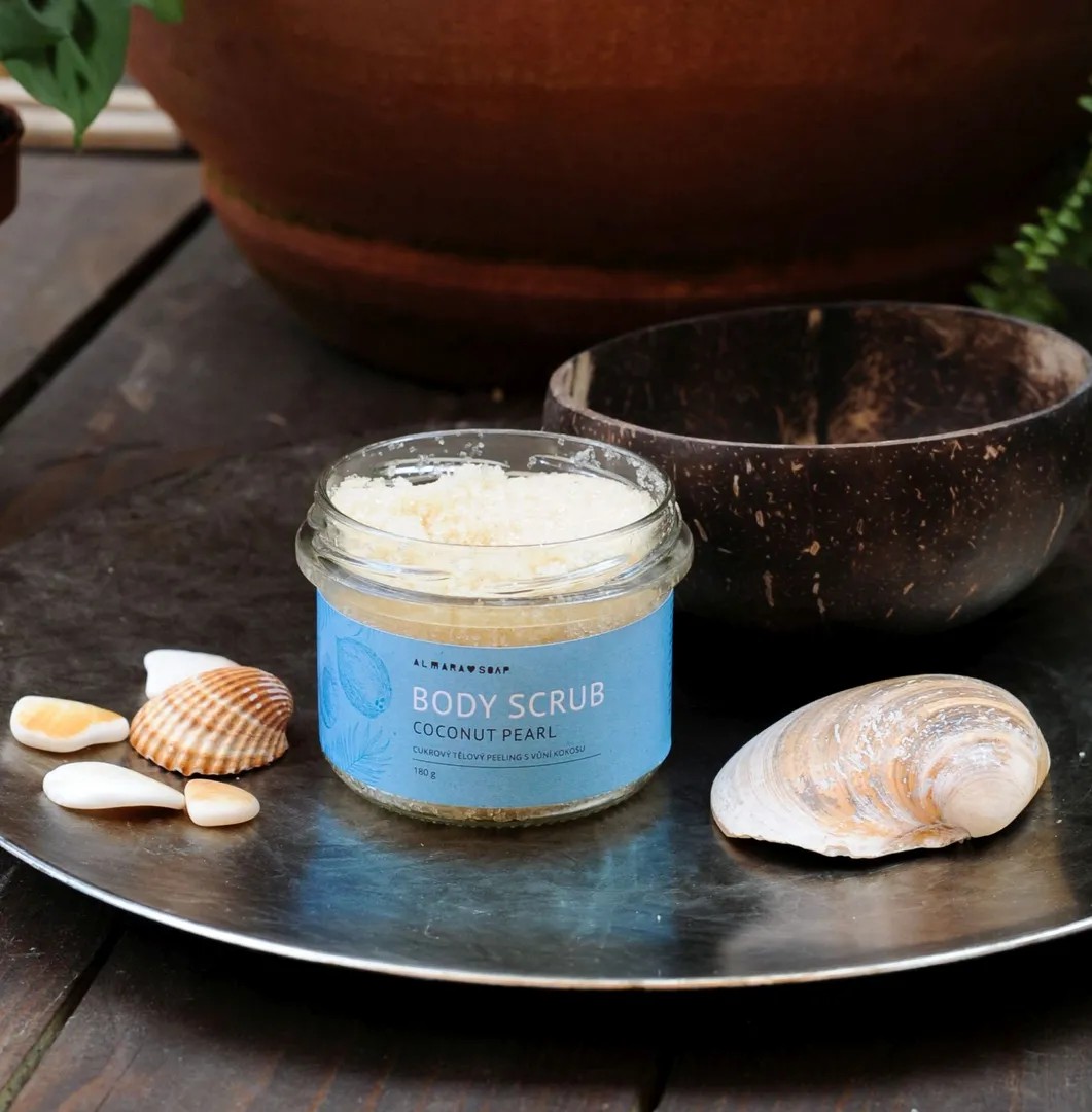 Peeling na tělo pomáhá odstraňovat odumřelé kožní buňky, stimuluje prokrvení a čistí póry. Po použití zanechává pokožku vyhlazenou a sametově hebkou. Doporučujeme jej zařadit do běžné péče o pokožku a používat 1-2x týdně. Scrub Coconut Pearl má základ z bio třtinového cukru. Dále je obohacený o rostlinné oleje – mandlový a BIO kokosový olej, díky kterým krásně klouže po pokožce a zároveň ji vyživí. Po opláchnutí zůstane pokožka promaštěná a není třeba používat tělové mléko či olej. Složení doplňuje strouhaný kokos a přírodní vůně kokosu. Ta je jemná, krémová, sladká a voní jako čerstvě utržený kokos.