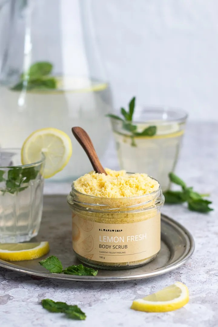 Cukrový peeling na tělo má krásnou svěží vůni citrónu. Je zabalen do ekologického skleněného obalu s kovovým víčkem, který po jeho spotřebování můžete znovu použít. Peeling pomáhá odstraňovat odumřelé kožní buňky, stimuluje prokrvení a čistí póry. Po použití zanechává pokožku vyhlazenou a sametově hebkou. Lemon Fresh má základ z jemně mleté mořské soli a bio třtinového cukru. Dále je obohacený o slunečnicový olej a nerafinované bambucké máslo doplněné o výtažek ze stromu borututu. Kořen Borututu obsahuje antioxidanty a má silné antibakteriální vlastnosti. Složení doplňuje čistě přírodní barvivo ve formě prášku z lyofilizovaného ovoce a esenciální olej citrónu. Po opláchnutí zůstane pokožka promaštěná a není třeba používat tělové mléko či olej. Nedoporučujeme používat pro extra citlivou pokožku a samozřejmě ani na obličej.