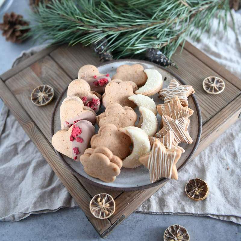 Složení: pšeničná mouka, cukr, rostlinný tuk, ovocná náplň jablečně-meruňková (cukr, jablka (35% hm.), meruňky (20% hm.), regulátor kyselosti: kyselina citrónová, antioxidant: kyselina askorbová, želírující látka: pek barviva: beta karoten a paprikový extrakt,aroma), perníkový pepř (mletá skořice, mletý koriandr, mletý badyán,mletý nový pepř,mletý hřebíček, mletý anýz, mletý muškátový oříšek, mletý muškátový květ , mletý mléko, kakaové máslo, vanilka, emulgátor: sójový lecitin, laktóza), mandlová mouka, vejce, med, kokos, sušené maliny, soda bikarbona