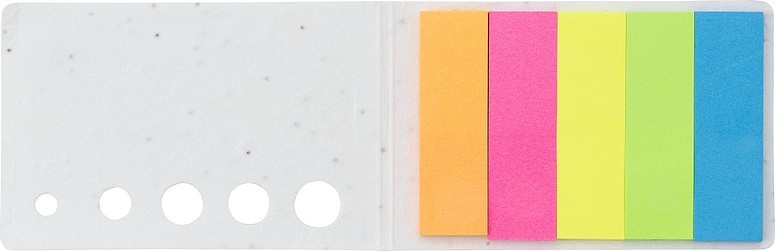 Sada značkovacích lístků. Sada obsahuje značkovací lístky v pěti barvách. Obálka sady je papírová se semínky uvnitř. Po spotřebování značkovacích lístků obálku můžete uložit do hlíny a díky obsaženým semínkům z obálky vyrostou rostlinky.